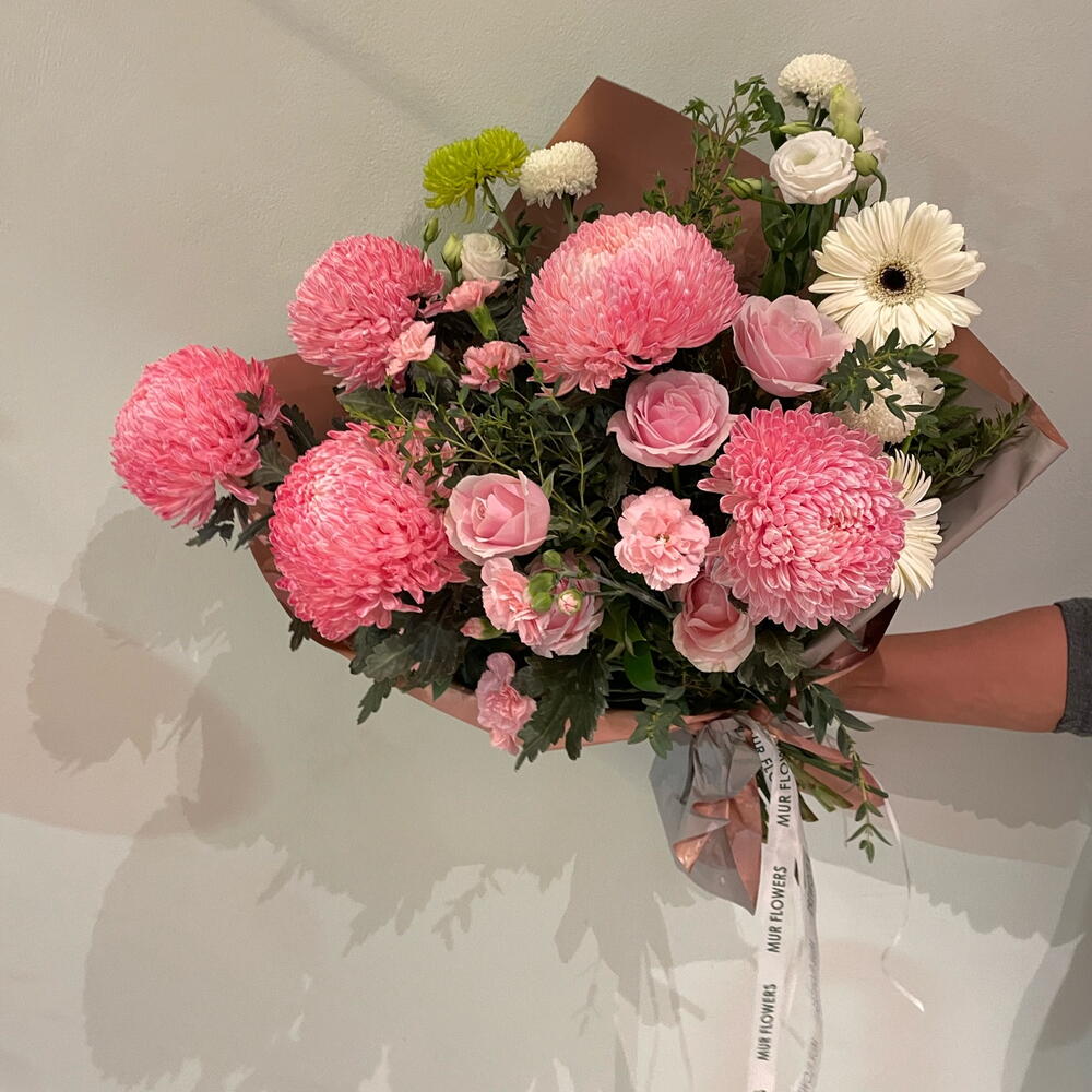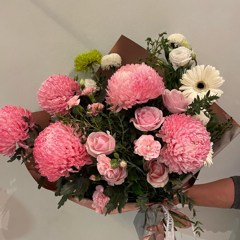 Peony rose - 5 pcs Gerbera - 2 pcs Lisianthus - 4 pcs Ruskus - 5 pcs rose - 6 pcs carnation - 4 pcs parvifolia - 4 pcs pompon - 3 pcs