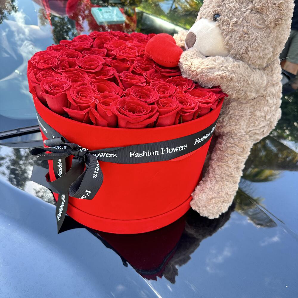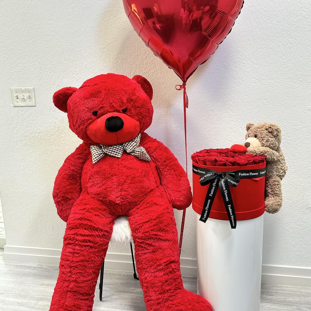 big giant teddy bear - 1 pcs big heart balloon - 1 pcs giant teddy bear and big heart balloon - 1 pcs big red velvet box with 50 roses - 1 pcs