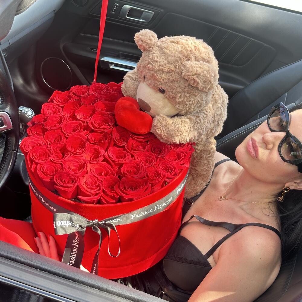 Big red velvet box with 50 roses, giant teddy bear 160 cm and big heart balloon