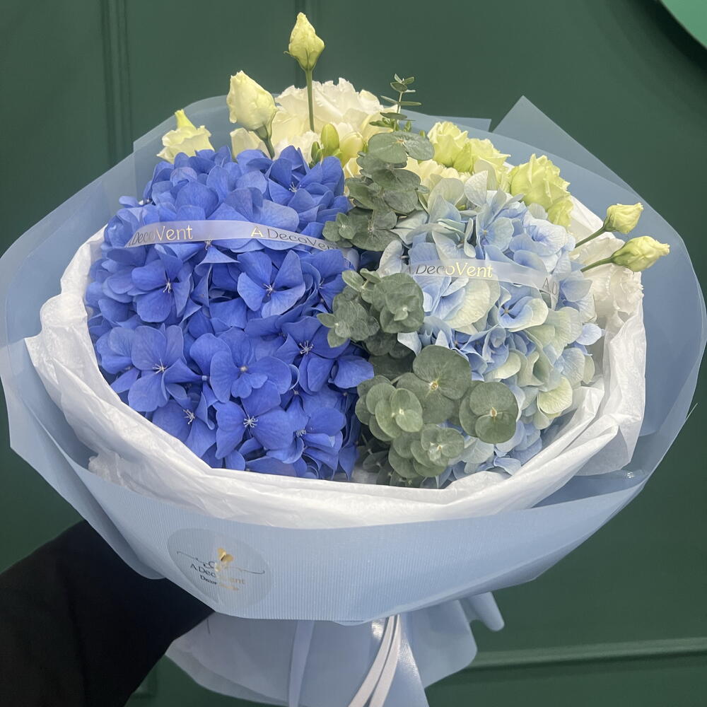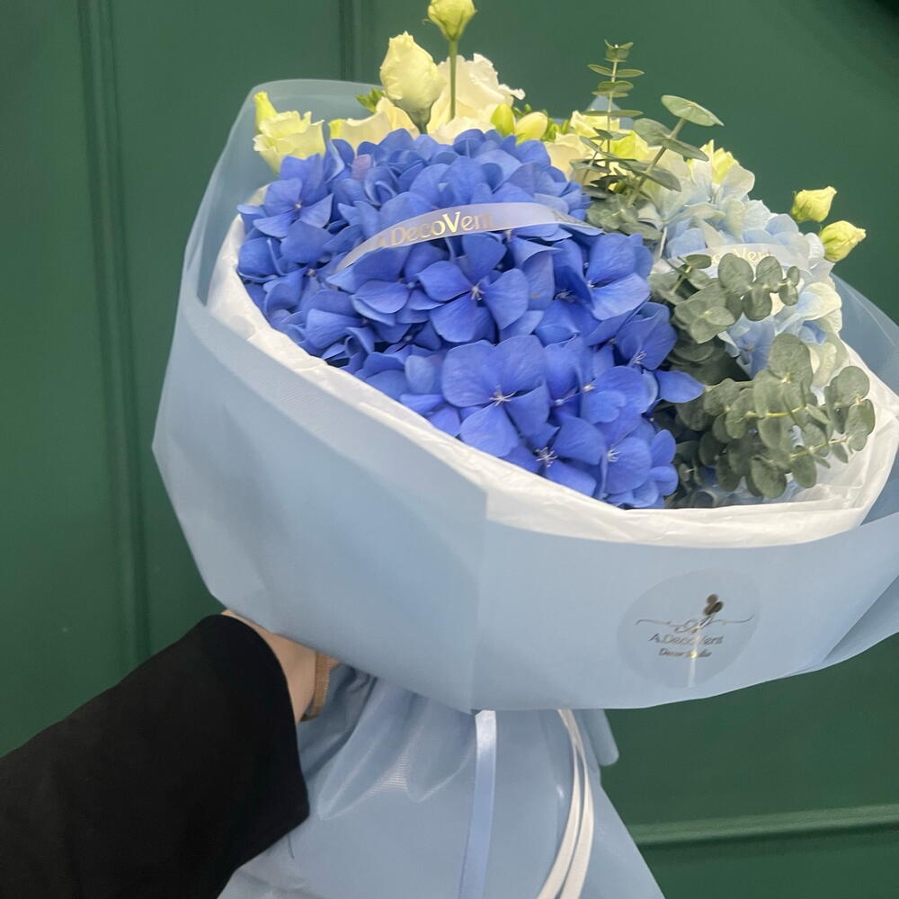 Eucalyptus - 3 pcs Rosen - 3 pcs hydrangea - 2 pcs Eustoma white - 3 pcs