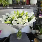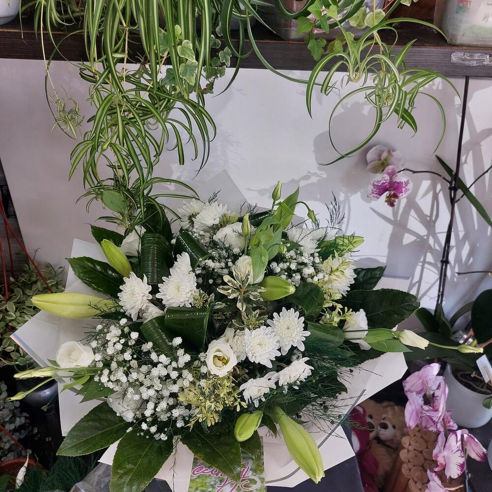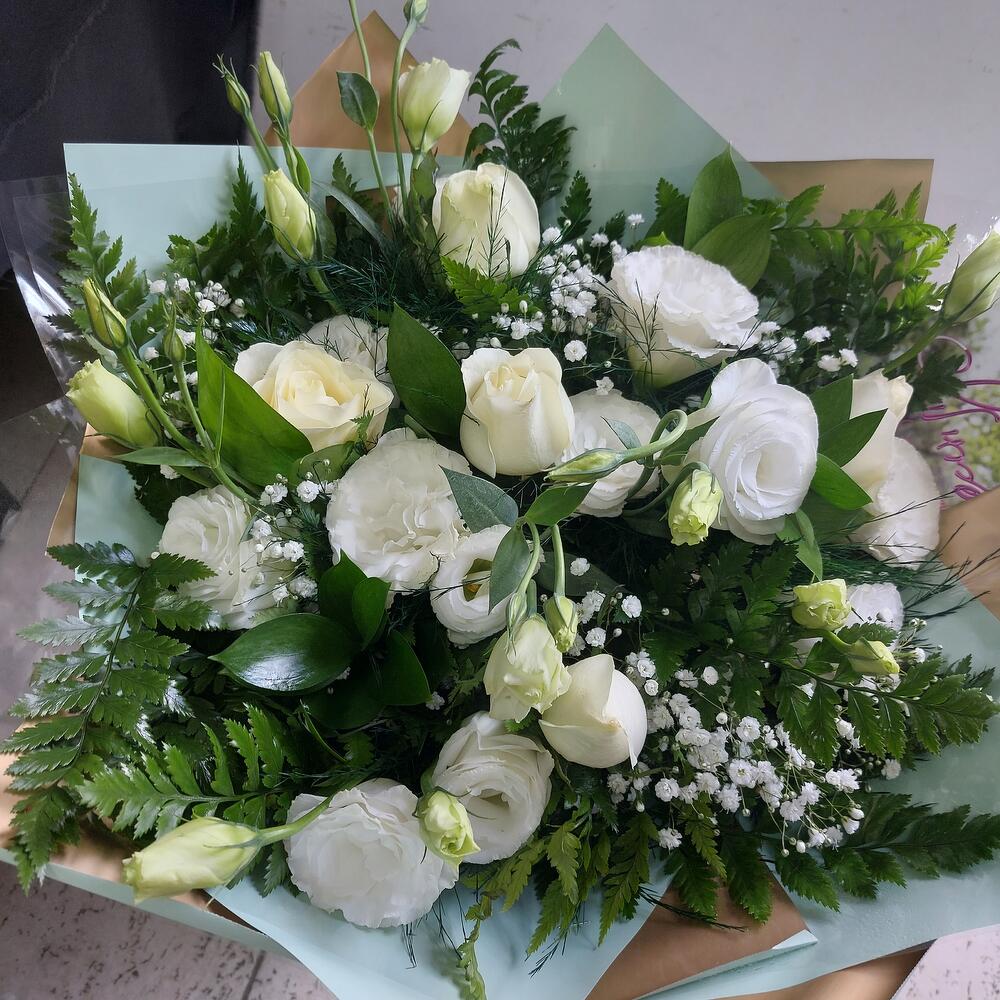 גיפסנית - 3 pcs וורגטוס - 7 pcs ליזיאנטוס לבן - 3 pcs חרצית לבן - 2 pcs שושן צחור רב פעמונים - 3 pcs פיטוספורום מגובנת - 3 pcs ארליות - 3 pcs