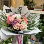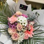 Satin ribbon - 1 pcs Eucalyptus - 1 pcs Gypsophila - 2 pcs white chrysanthemum - 3 pcs wrap paper - 5 pcs wax - 2 pcs palm leaf - 2 pcs mix carnation - 3 pcs mix gerber - 2 pcs mix roses - 5 pcs