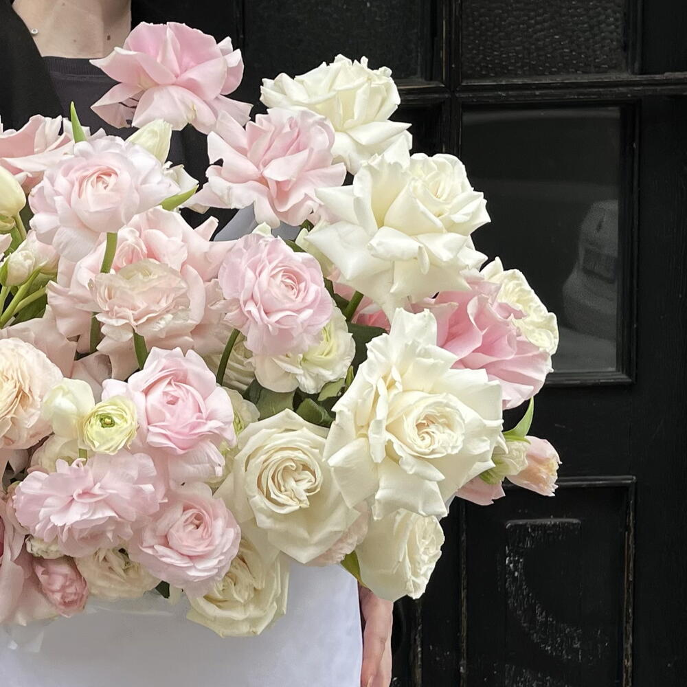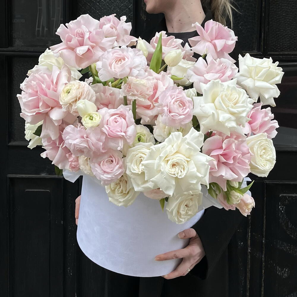 Ecuadorian rose - 30 pcs Oasis - 4 pcs box hat - 1 pcs ranunculus - 15 pcs tulipa - 30 pcs