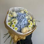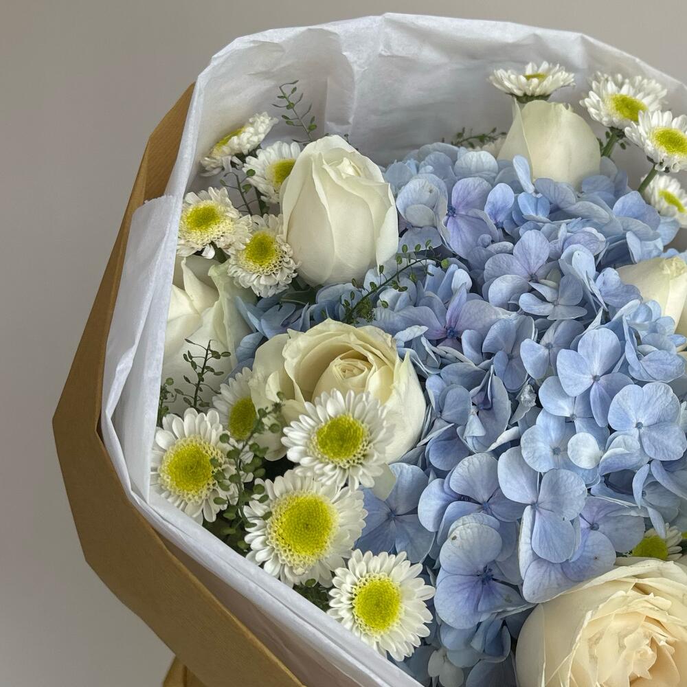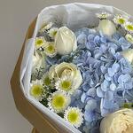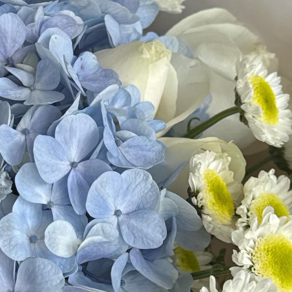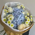 tlaspi - 1 pcs white crysentemum - 2 pcs blu hidra - 1 pcs local roses - 6 pcs