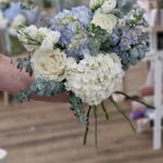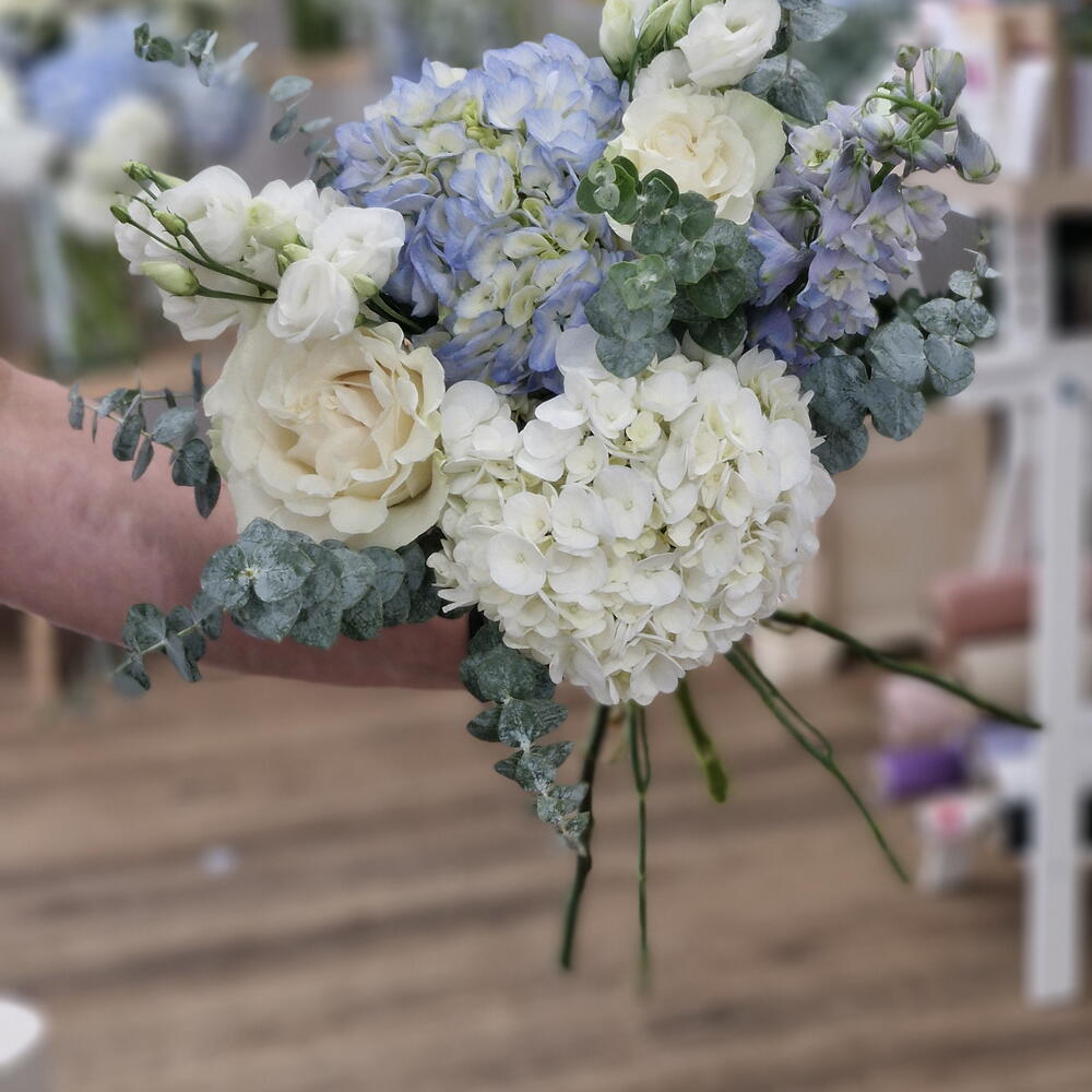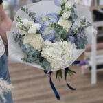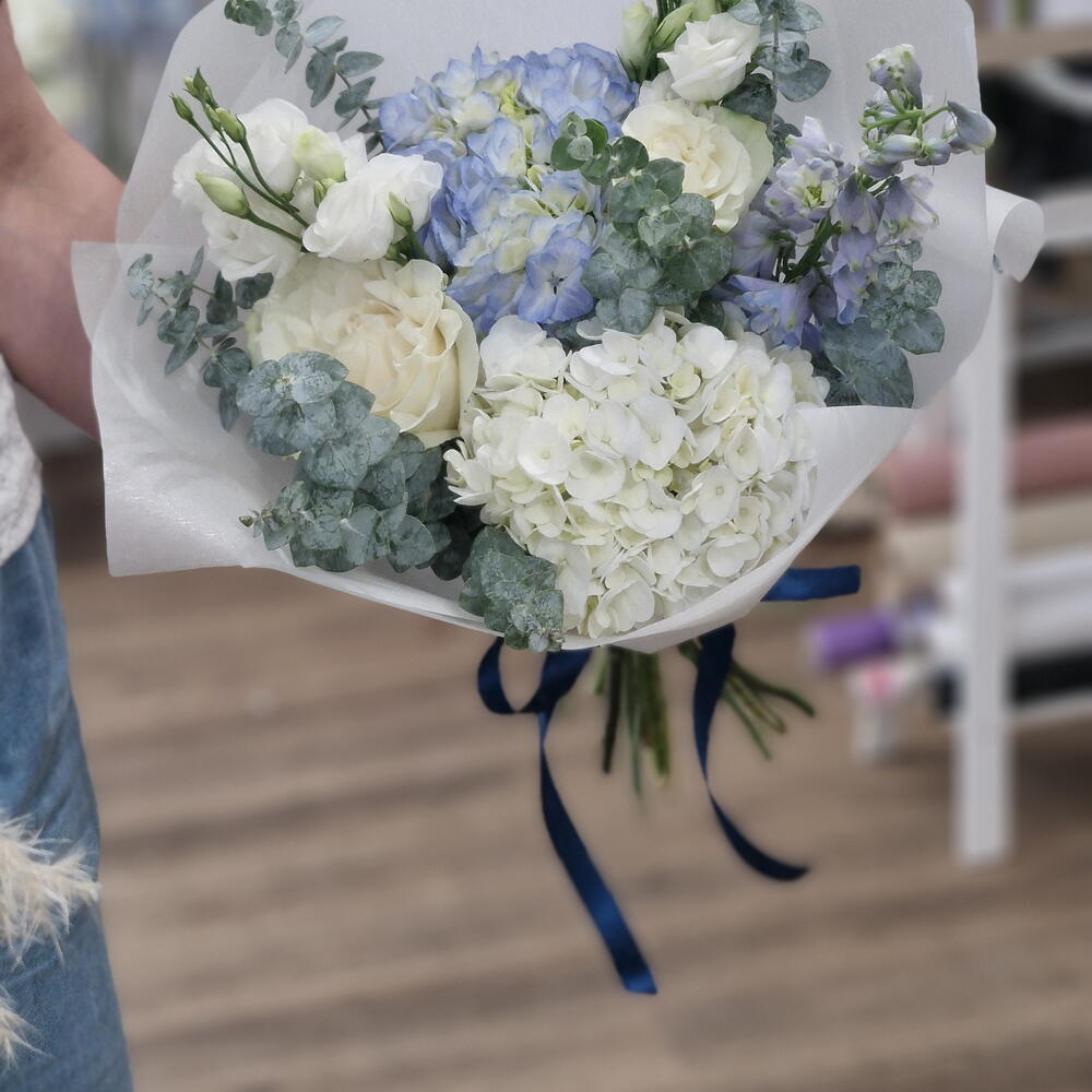 Eustoma - 2 pcs Eucalyptus - 5 pcs Hydrangea - 2 pcs rose - 2 pcs delphinium - 1 pcs