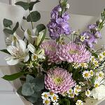 Alstroemeria - 1 pcs Matthiola - 2 pcs Eucalyptus - 3 pcs Dianthus - 2 pcs Matricaria - 3 pcs Chrysanthemum one - headed - 3 pcs Pistachio bunch - 1 pcs