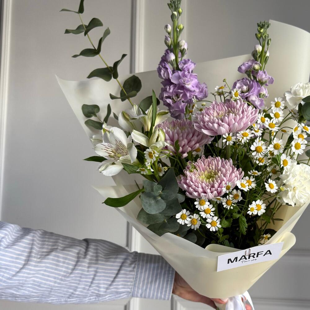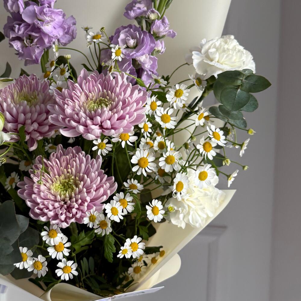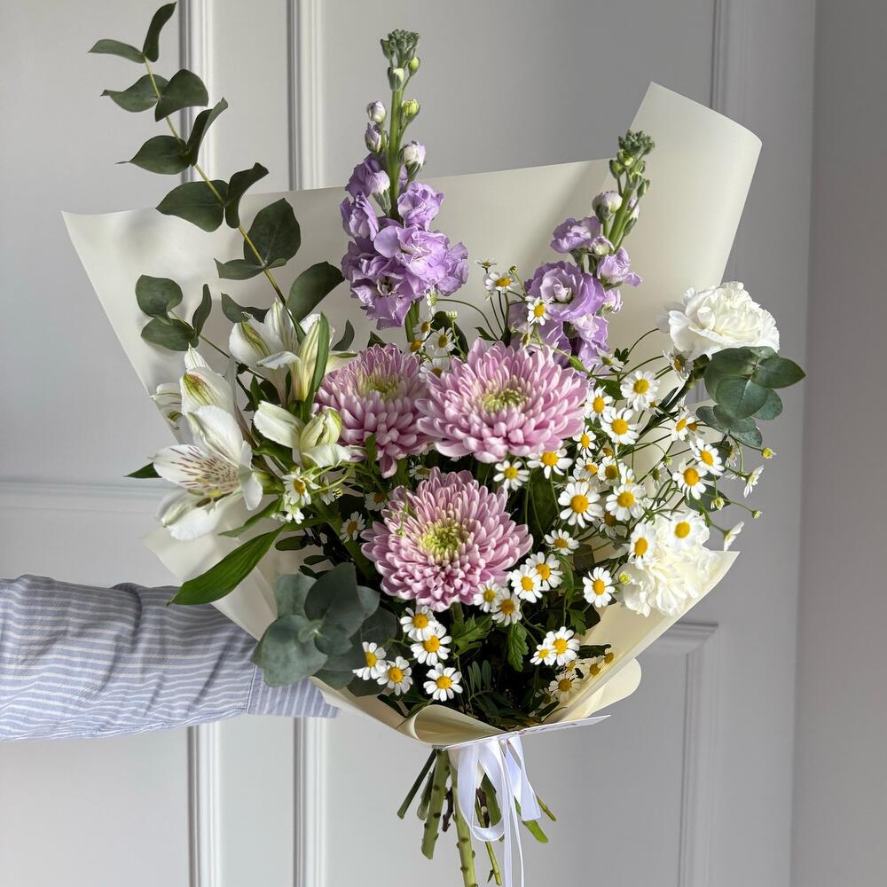 Alstroemeria - 1 pcs Matthiola - 2 pcs Eucalyptus - 3 pcs Dianthus - 2 pcs Matricaria - 3 pcs Chrysanthemum one - headed - 3 pcs Pistachio bunch - 1 pcs