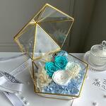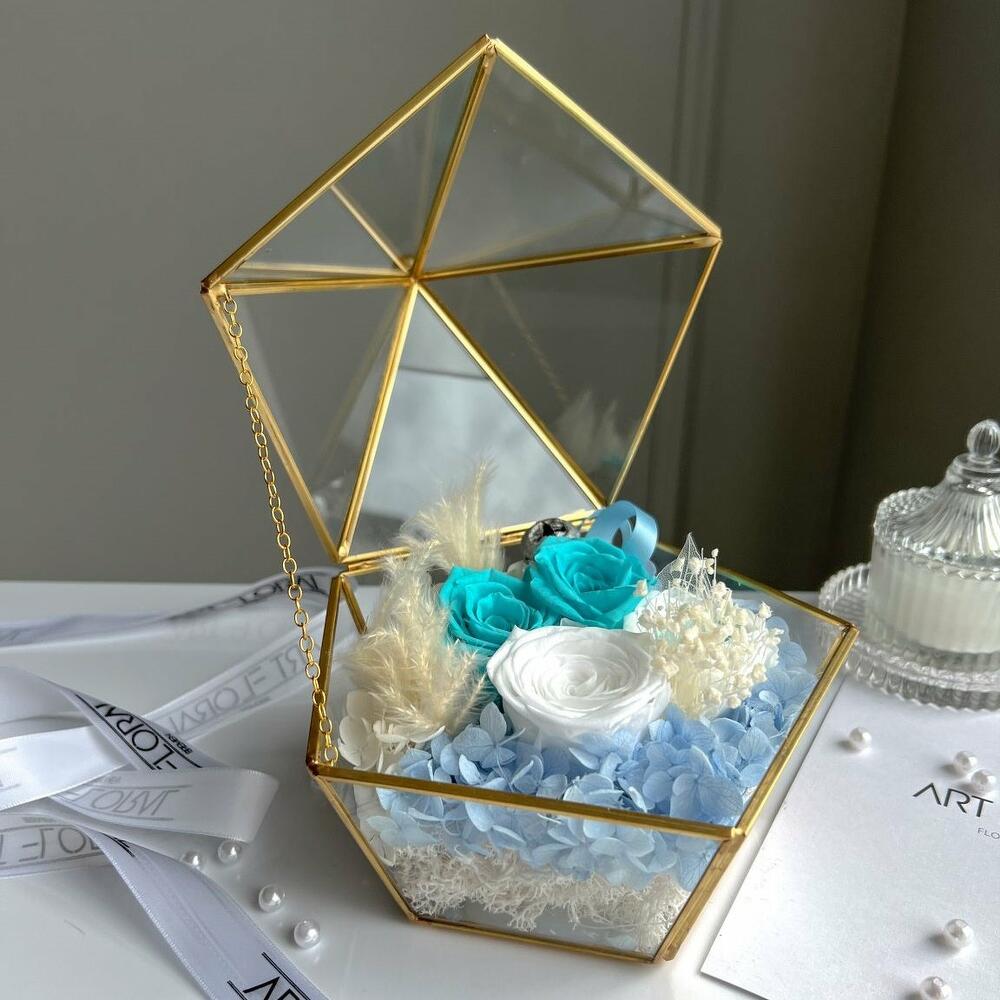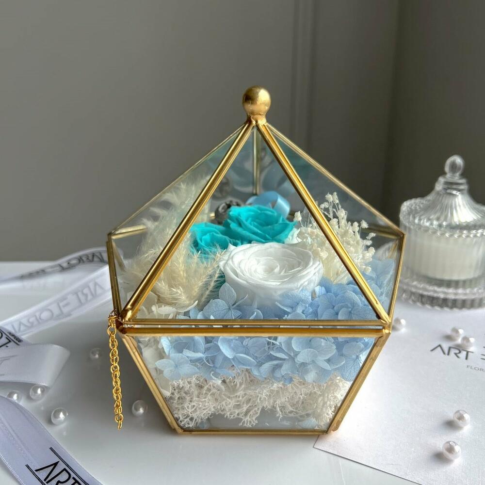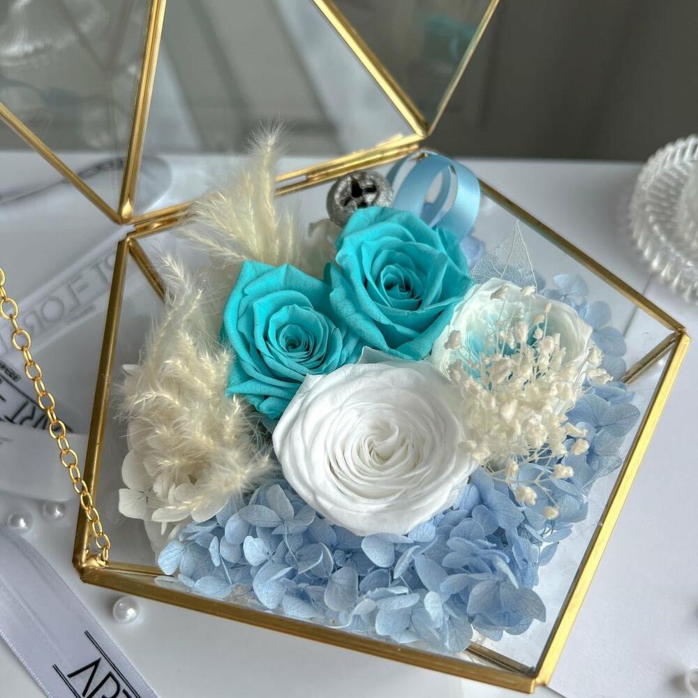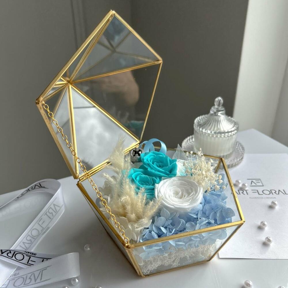 Blumen Terrarium Aqua-Blütenrausch. Die erfrischende Welt von Aqua-Blütenrausch – einem exquisiten Terrarium im Schatullenformat, umhüllt von einem goldfarbenen Rahmen und Glas, gefüllt mit einem faszinierenden haltbaren Infinity Blumenarrangement. Diese meisterhafte Kreation vereint eine Auswahl an Blumen in den Farben Weiß, Türkis und Babyblau, die in einem harmonischen Mix aus Frische und Leichtigkeit erstrahlen. Das Terrarium im Schatullenformat präsentiert sich als wahres Schmuckstück und verleiht dem Blumenarrangement einen Hauch von raffinierter Eleganz. Der goldene Rahmen und das Glas verschmelzen zu einer prächtigen Umgebung, die die strahlende Schönheit der Blumen hervorhebt und ihnen einen Hauch von königlichem Glanz verleiht. Das Blumenarrangement selbst ist eine faszinierende Verschmelzung von Frische und Leichtigkeit. Die weißen, türkisen und babyblauen Blumen fügen sich zu einem bezaubernden Kontrast zusammen und erzeugen eine Aura von Ruhe und Gelassenheit. Aqua-Blütenrausch ist nicht nur ein luxuriöses Dekorationsstück für Ihr Zuhause, Büro oder jeden anderen Raum, sondern auch ein einzigartiges Geschenk für besondere Anlässe wie Hochzeiten, Jubiläen oder Geburtstage. Tauchen Sie ein in die erfrischende Schönheit dieser faszinierenden Blumenkomposition und lassen Sie sich von ihrer strahlenden Anziehungskraft verzaubern.