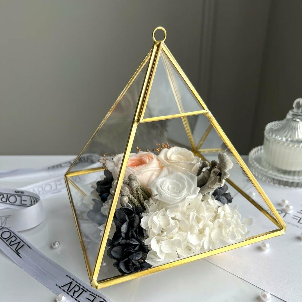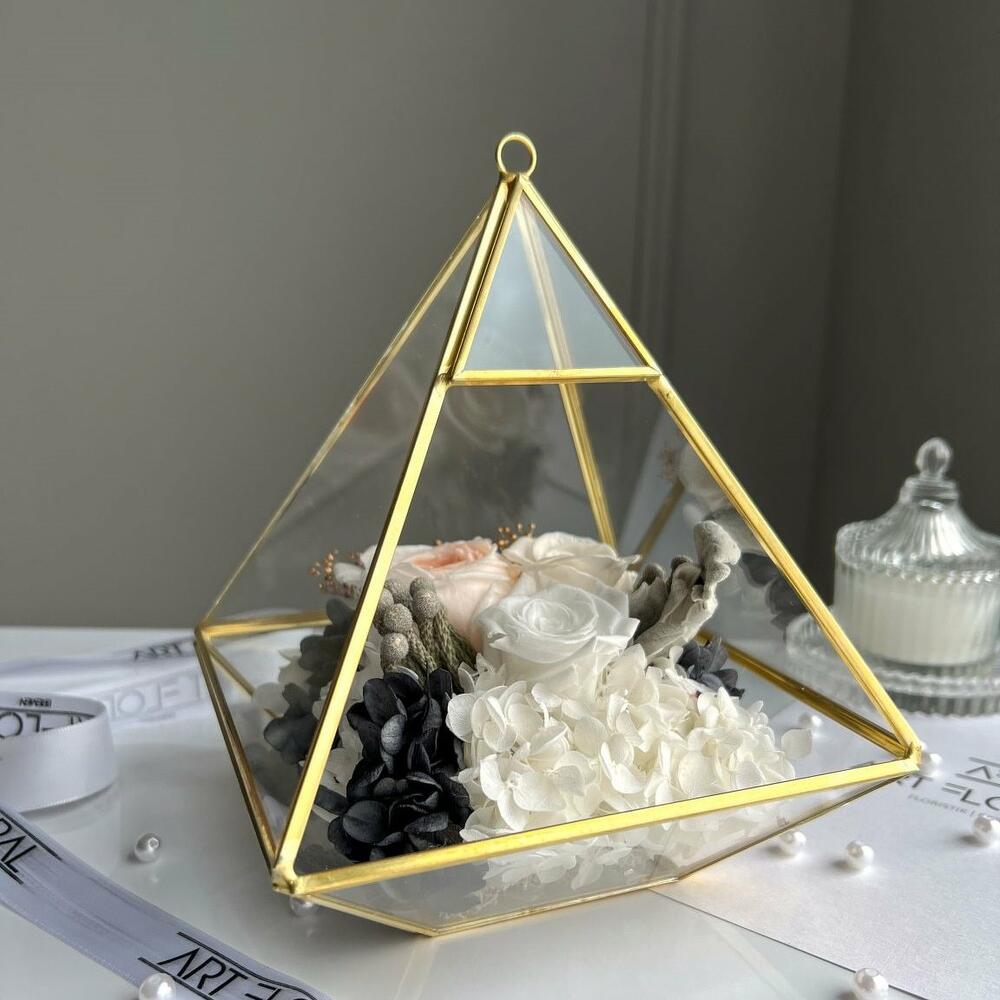 Blumen Terrarium Symphonie-Pyramide. Willkommen in der zauberhaften Welt von Symphonie-Pyramide – einem bezaubernden Terrarium im Pyramidenformat, umhüllt von einem edlen goldfarbenen Rahmen und Glas. In seinem Inneren birgt es ein faszinierendes haltbares Infinity Blumenarrangement, bestehend aus einer exquisiten Auswahl an Rosen, Gartenrosen, Hortensien und weiteren Blumen. Die Farben der Blumen sind eine zauberhafte Mischung aus Weiß, Grau und Schwarz mit einer sanften Pfirsichnote, die zusammen eine Aura von Eleganz und Romantik erzeugen. Das Pyramidenformat verleiht diesem Terrarium eine einzigartige und beeindruckende Erscheinung, die jedem Raum einen Hauch von königlicher Pracht verleiht. Der goldfarbene Rahmen und das Glas schaffen eine prächtige Umgebung, die die strahlende Schönheit der Blumen hervorhebt und sie in ihrem strahlenden Glanz erstrahlen lässt. Das Blumenarrangement selbst ist eine kunstvolle Komposition, die durch die Kombination von Weiß, Grau und Schwarz mit einer Pfirsichnote eine unvergleichliche Anziehungskraft ausstrahlt. Die Rosen, Gartenrosen, Hortensien und weiteren Blumen fügen sich harmonisch zusammen und erzeugen eine Atmosphäre von Luxus und Stil. Symphonie-Pyramide ist nicht nur ein atemberaubendes Dekorationsstück für Ihr Zuhause, Büro oder jeden anderen Raum, sondern auch ein unvergessliches Geschenk für besondere Anlässe wie Hochzeiten, Jubiläen oder Geburtstage. Tauchen Sie ein in die zauberhafte Schönheit dieses faszinierenden Terrariums und lassen Sie sich von seiner zeitlosen Eleganz verzaubern.