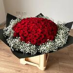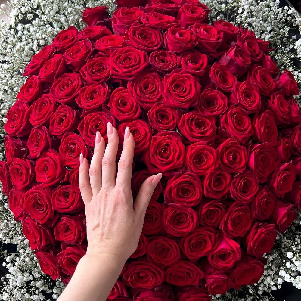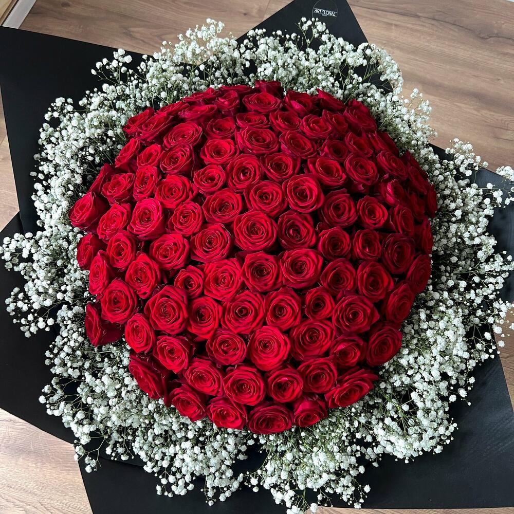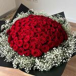 Blumenstrauß 100 Rosen und Schleierkraut Ein wahres Meisterwerk der Liebe und Eleganz: Unser prachtvoller Strauß aus 100 leuchtend roten Rosen, kunstvoll umrahmt von feiner weißer Gypsophila (Schleierkraut), ist ein atemberaubender Ausdruck tiefster Gefühle. Die roten Rosen, das klassische Symbol für Liebe, Leidenschaft und Bewunderung, entfalten zusammen mit der zarten weißen Gypsophila eine romantische Leichtigkeit und verleihen dem Strauß eine besondere Ausstrahlung. Jede einzelne Rose wird sorgfältig ausgewählt und zu einem beeindruckenden Kunstwerk gebunden, das sofort alle Blicke auf sich zieht. Dieser luxuriöse Rosenstrauß ist die perfekte Wahl für große Liebeserklärungen, Hochzeiten, Jubiläen oder um einen unvergesslichen Moment zu schaffen, der für immer im Herzen bleibt. Liebevoll arrangiert und elegant präsentiert, ist dieses florale Meisterwerk ein Geschenk, das Worte überflüssig macht und pure Emotionen spricht. Überrasche einen geliebten Menschen mit der kraftvollen Schönheit von 100 Rosen – ein Geschenk, das für ewige Liebe und unvergleichliche Wertschätzung steht. Wir achten ständig auf die letzten Trends im Bereich des Floristikdesigns und unsere Bouquets sind die Reflexion davon. Bei der Zusammenstellung verwenden wir nur ganz frische Blumen und die modernsten Materialien. Unser Team steckt besondere Liebe zum Detail in jedes Arrangement, deshalb finden Sie immer einen Sticker mit unserem Logo und ein Firmen Bändchen als Qualitätssiegel an jedem Strauß. Es handelt sich um ein Naturprodukt, dadurch sind naturbedingte Abweichungen in der Form, Farbe oder Größe zu den Angaben möglich! Dem Blumenstrauß legen wir eine Anleitung zur Pflege und ein Mittel zur Verlängerung der Lebensdauer der Blumen bei. Jetzt ganz bequem bestellen und Ihre Blumen an Ihre Wunschadresse liefern lassen. ширина, см: 51 высота, см: 70 длина, см: 52