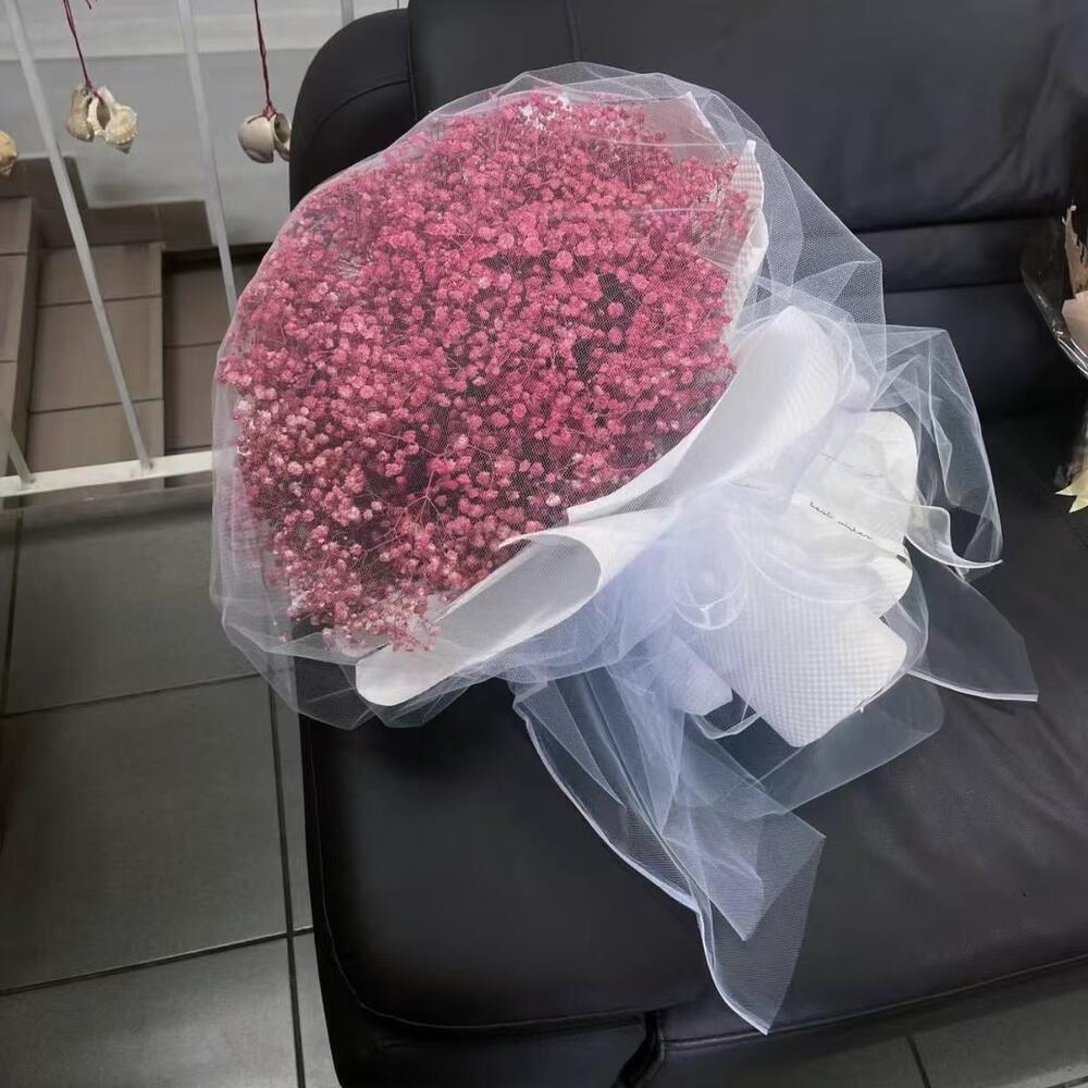 Elegant pink baby’s breath bouquet wrapped in white tulle, perfect for special occasions.
