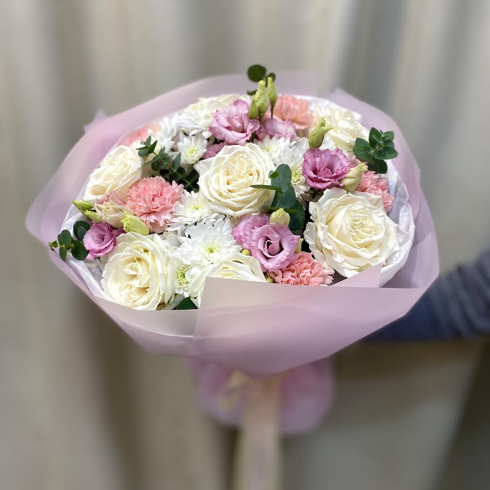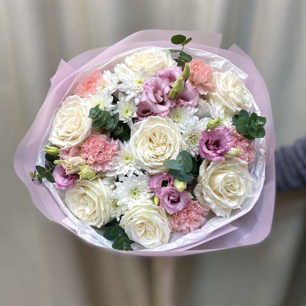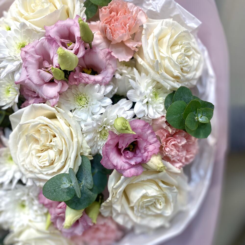 Eustoma - 4 pcs packaging - 5 pcs dianthus - 5 pcs eucalyptus - 2 pcs chrysanthemum - 3 pcs roses - 7 pcs