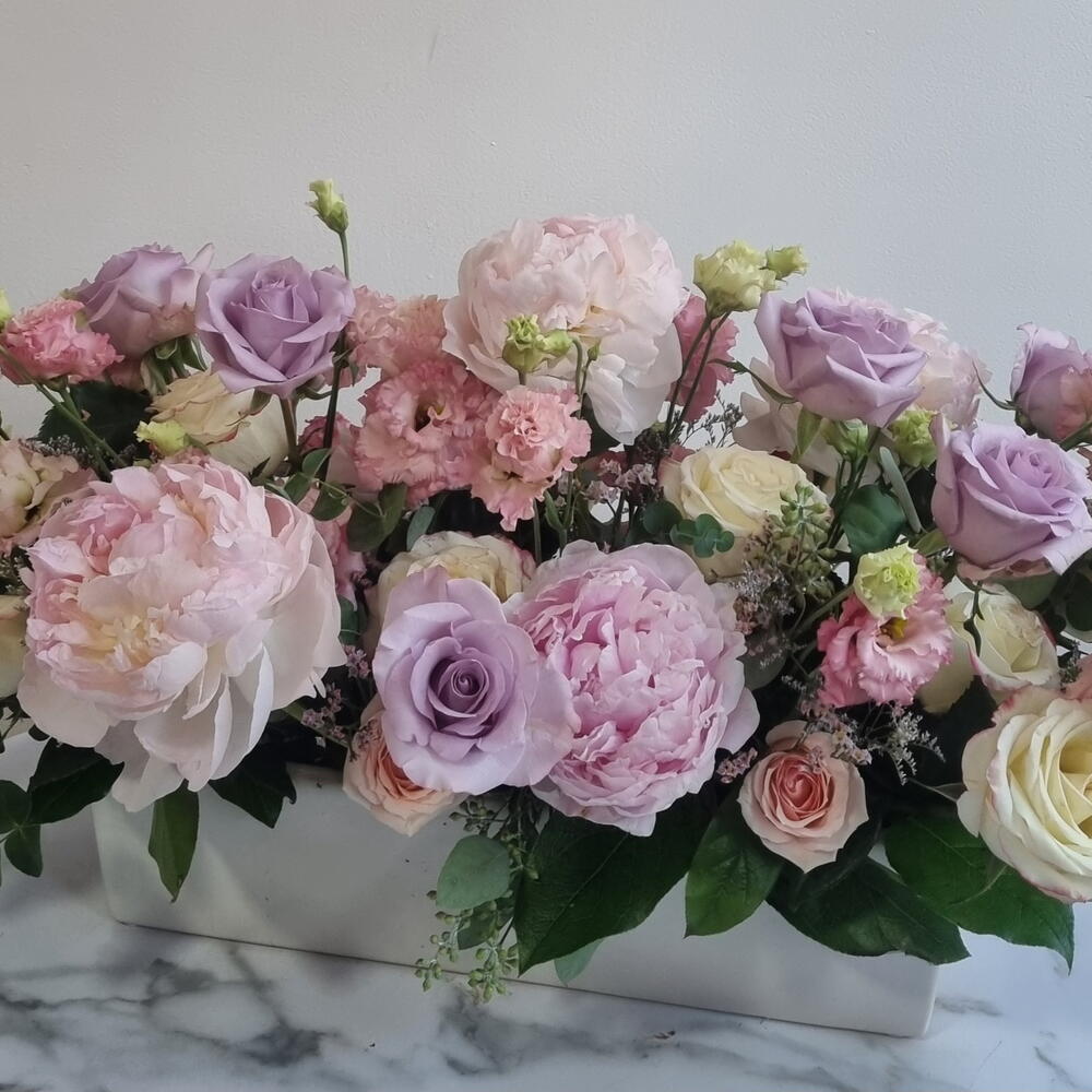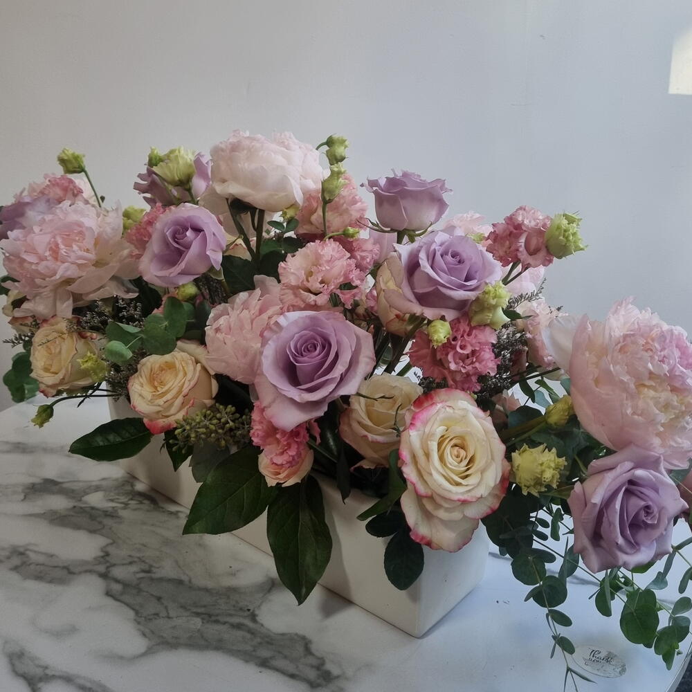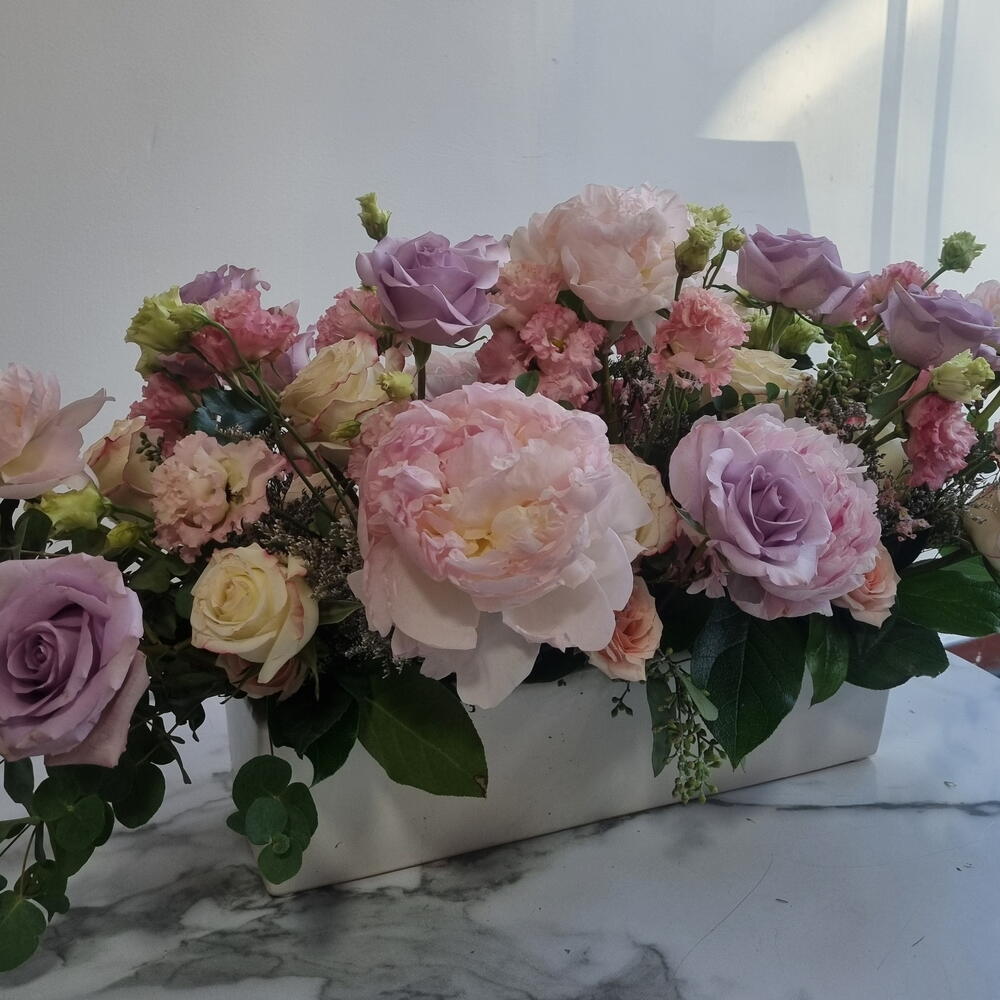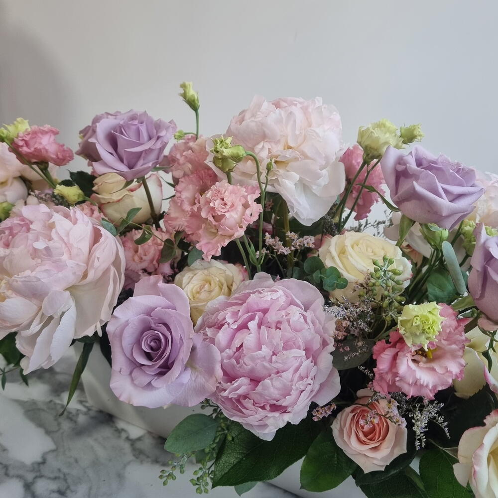 Blush Harmony is a soft, romantic floral arrangement created in a modern ceramic container. Featuring pastel roses, peonies, lisianthus, and seasonal blooms, this design is thoughtfully accented with fresh greenery for a light, airy feel. Perfect for birthdays, anniversaries, housewarmings, or as an elegant interior accent. Flowers may vary slightly depending on seasonal availability, while maintaining the overall color palette and style.