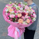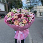Satin ribbon - 2 pcs Eustoma - 13 pcs Spray rose - 9 pcs Alstroemeria - 16 pcs carnation - 10 pcs garden rose - 10 pcs decorative wrapping - 1 pcs