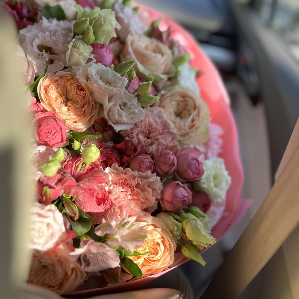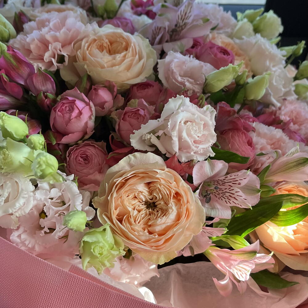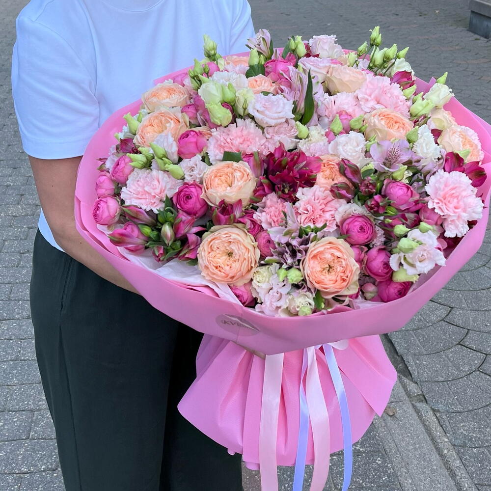 Satin ribbon - 2 pcs Eustoma - 13 pcs Spray rose - 9 pcs Alstroemeria - 16 pcs carnation - 10 pcs garden rose - 10 pcs decorative wrapping - 1 pcs