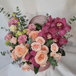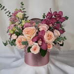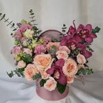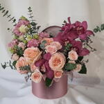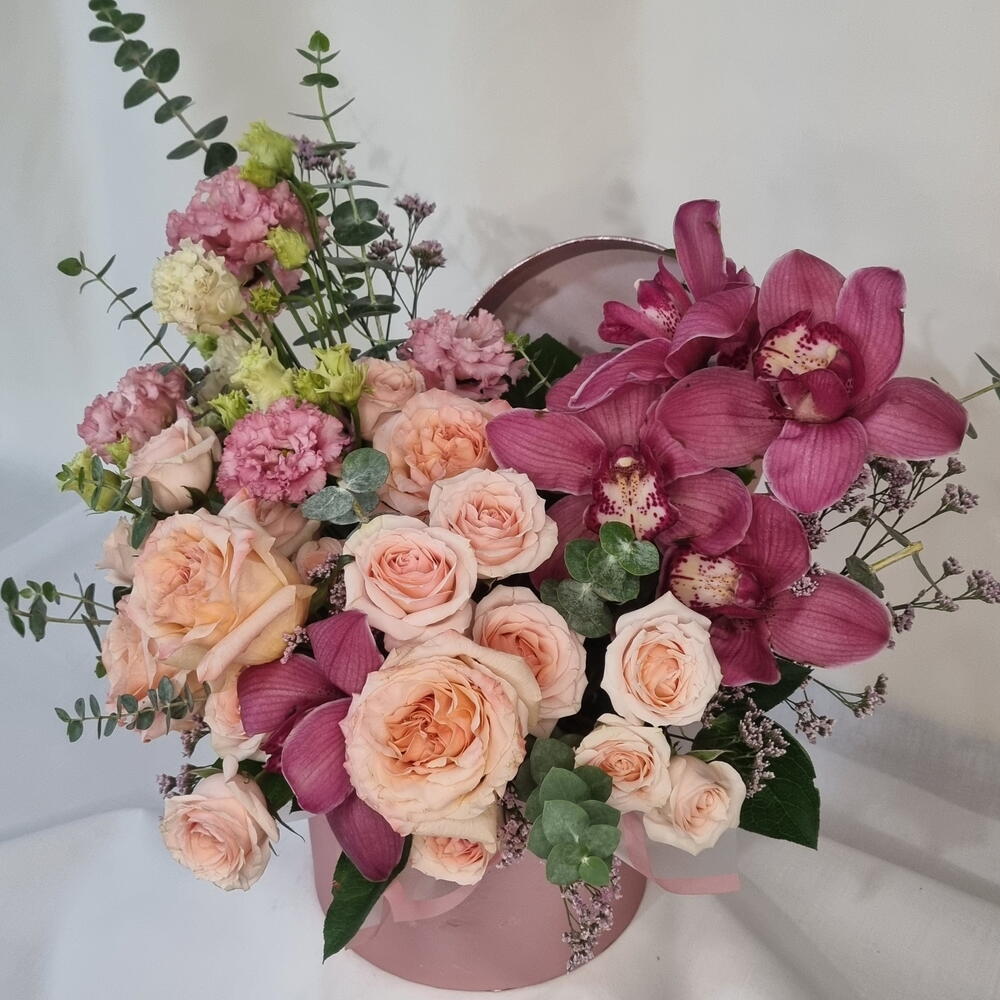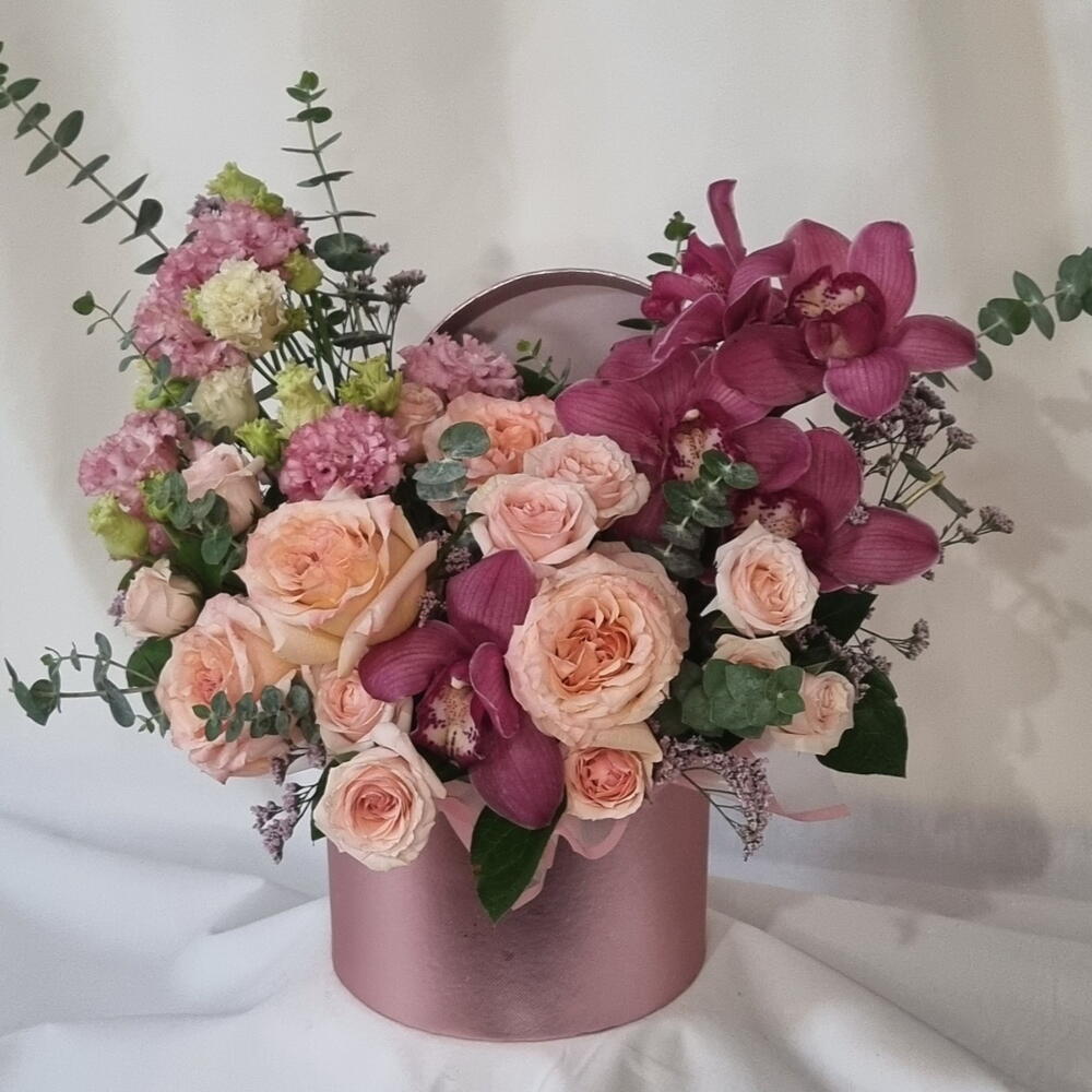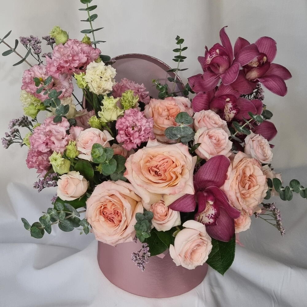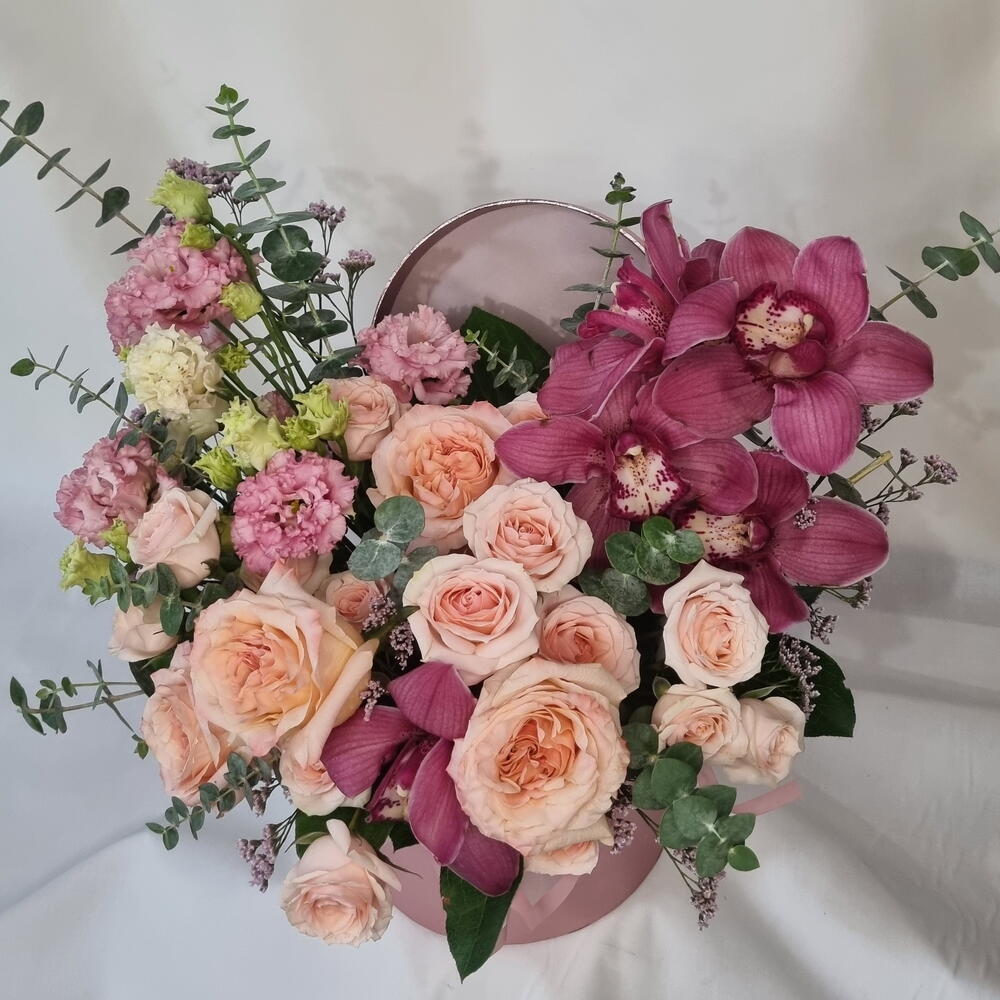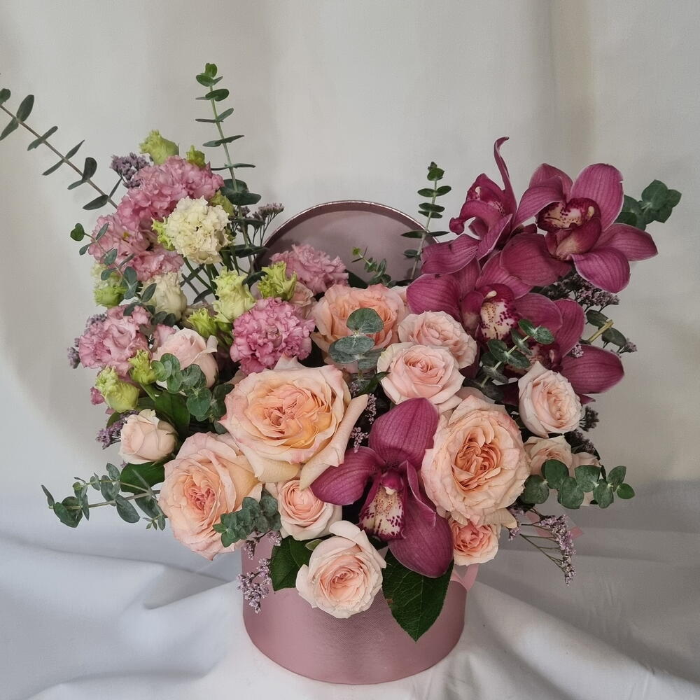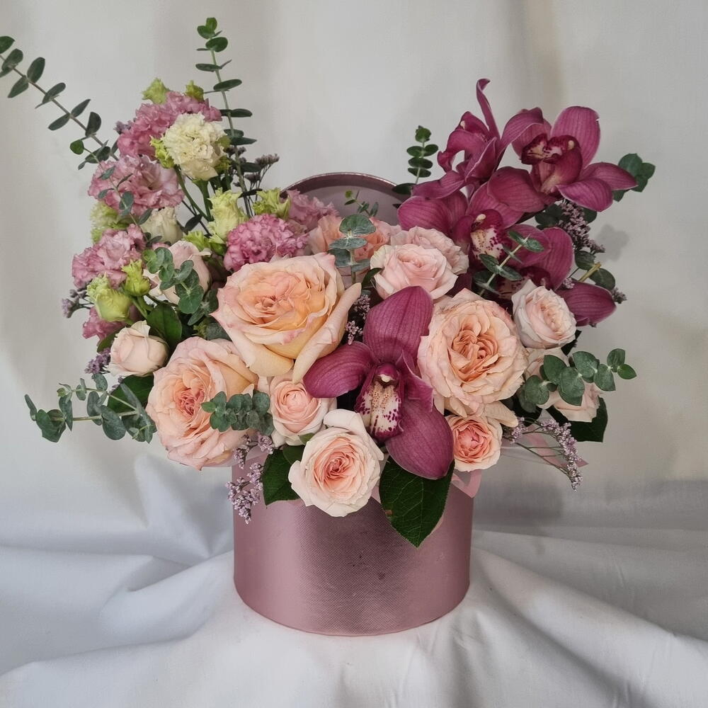 A romantic floral arrangement featuring soft blush roses paired with rich burgundy orchids, airy lisianthus, and fresh eucalyptus. Designed in a stylish round hat box, this composition feels elegant, expressive, and modern. Perfect for birthdays, anniversaries, romantic gestures, or when you want to make a lasting impression. Each arrangement is handcrafted and may vary slightly depending on seasonal availability, while preserving its color palette, style, and overall value. ✔️ Designed in a decorative hat box ✔️ Premium fresh flowers ✔️ Soft blush and deep berry tones ✔️ Elegant gift-ready presentation