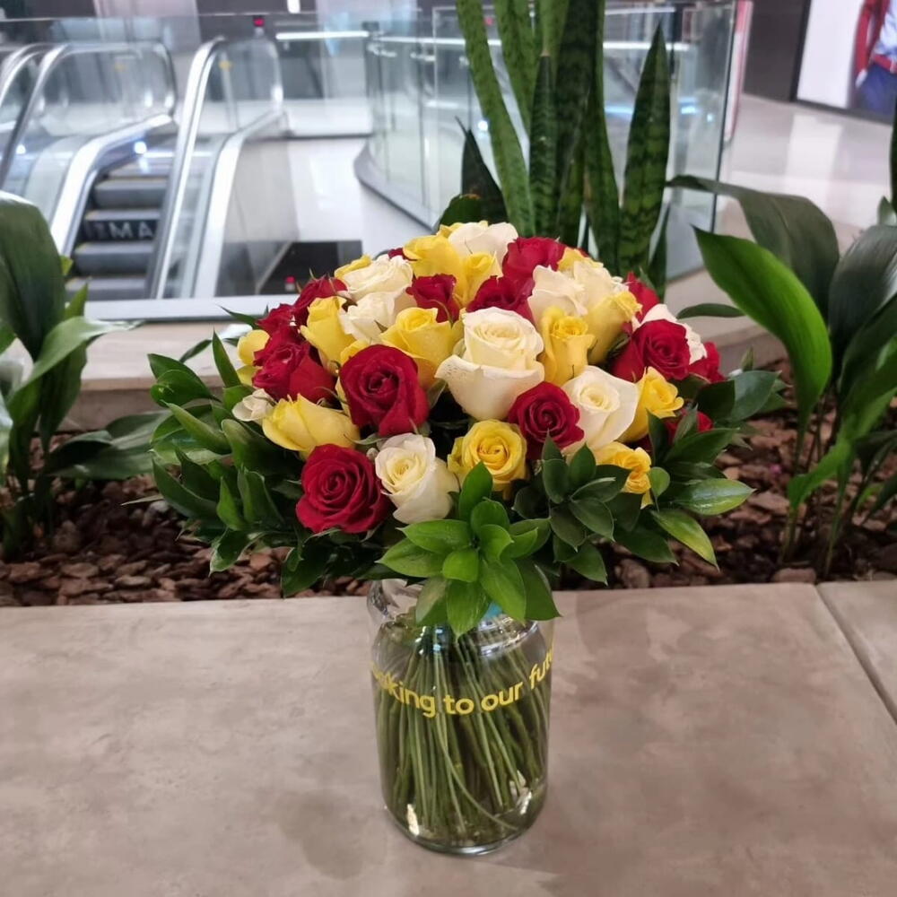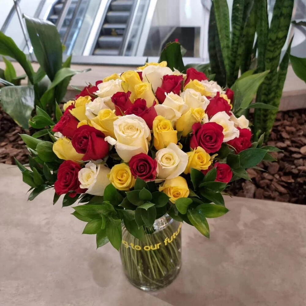 red roses - 20 pcs white roses - 15 pcs yellow roses - 20 pcs stems ruscus - 30 pcs