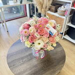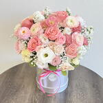 Lisianthus - 3 pcs ranunculus - 5 pcs lisianthus white - 5 pcs dahlia - 3 pcs gypsophila - 5 pcs stock - 3 pcs roses - 16 pcs spray roses - 5 pcs