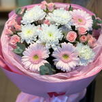Gerbera - 3 pcs eukalyptus - 3 pcs rosa spray - 2 pcs hrizantema - 1 pcs disntus - 1 pcs
