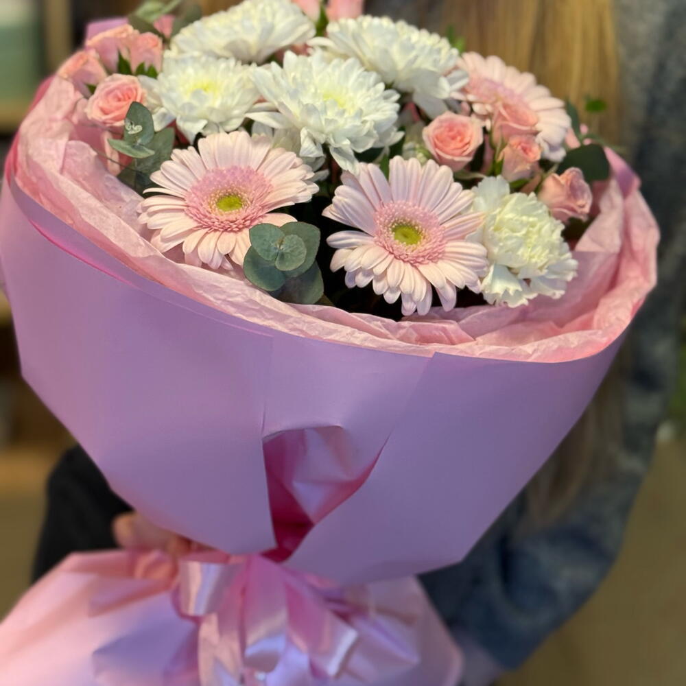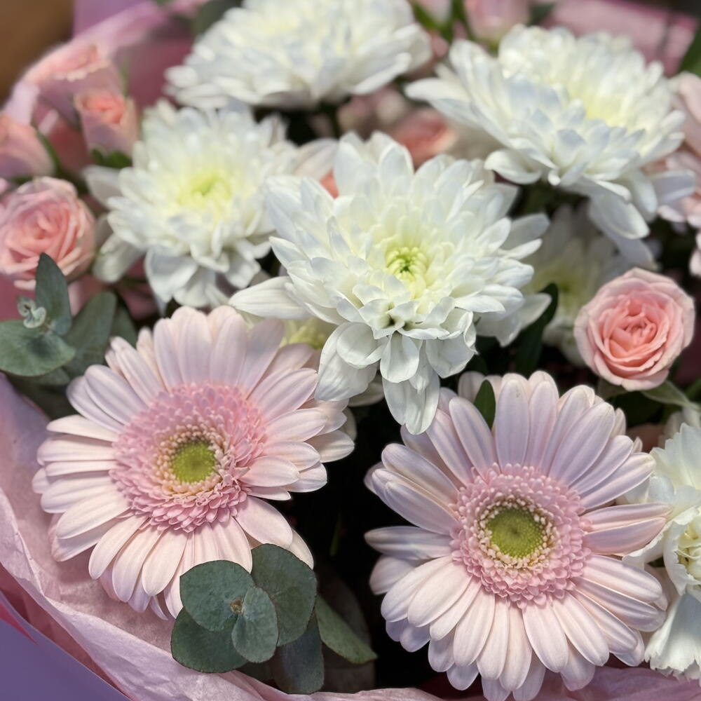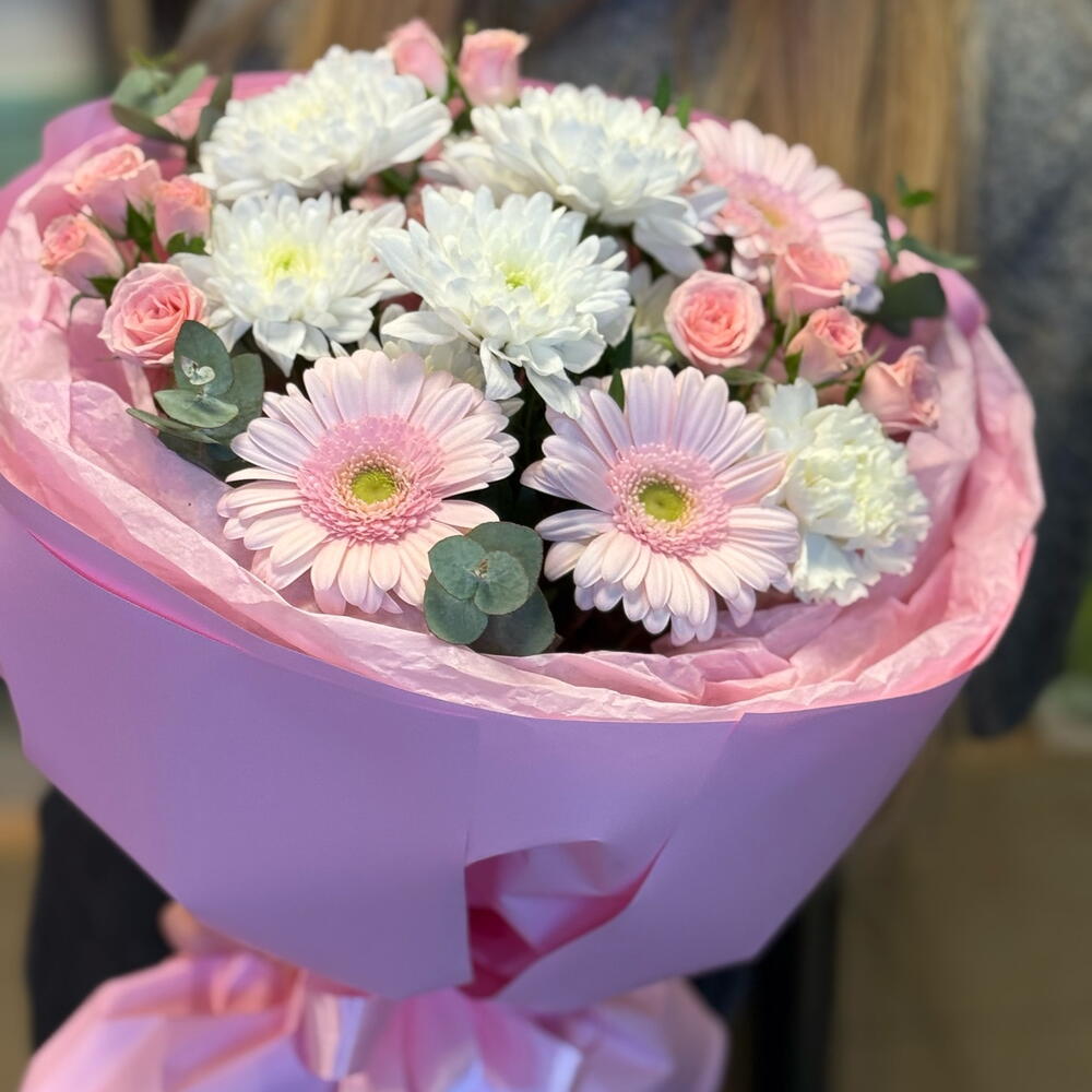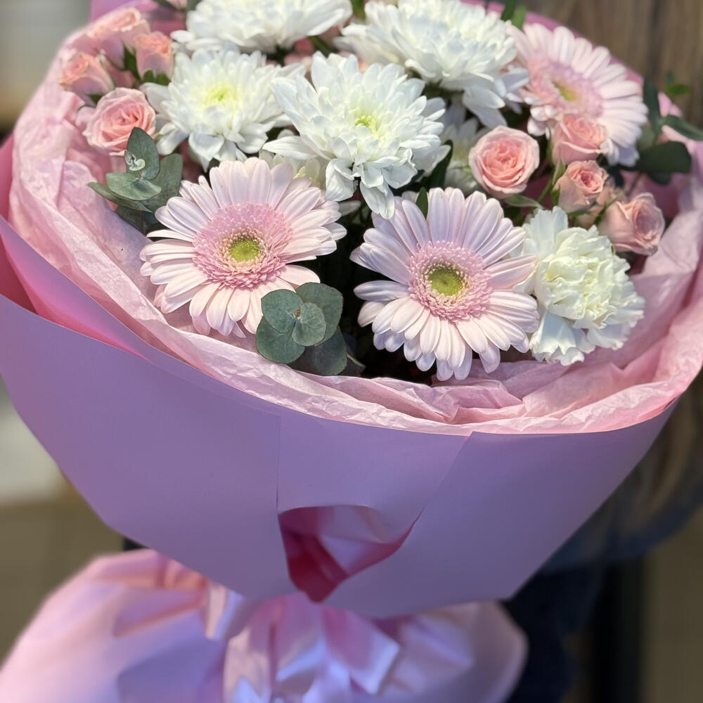 Gerbera - 3 pcs eukalyptus - 3 pcs rosa spray - 2 pcs hrizantema - 1 pcs disntus - 1 pcs