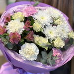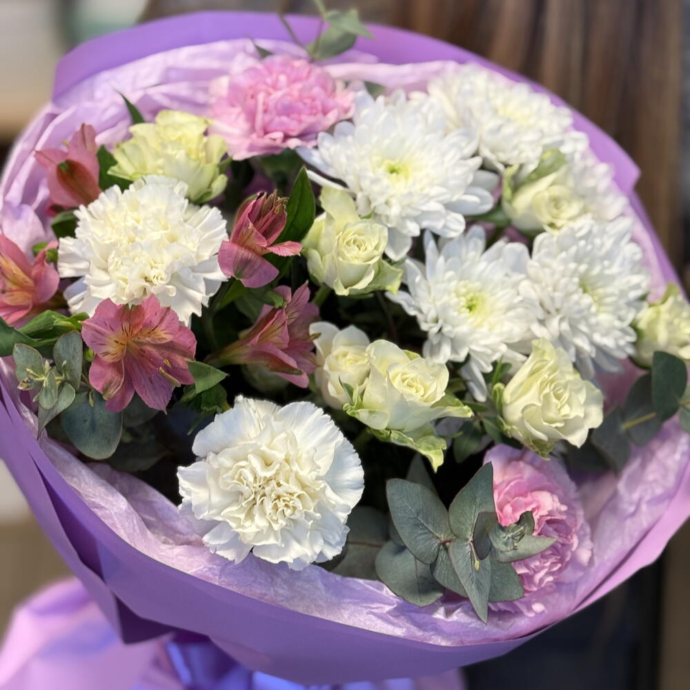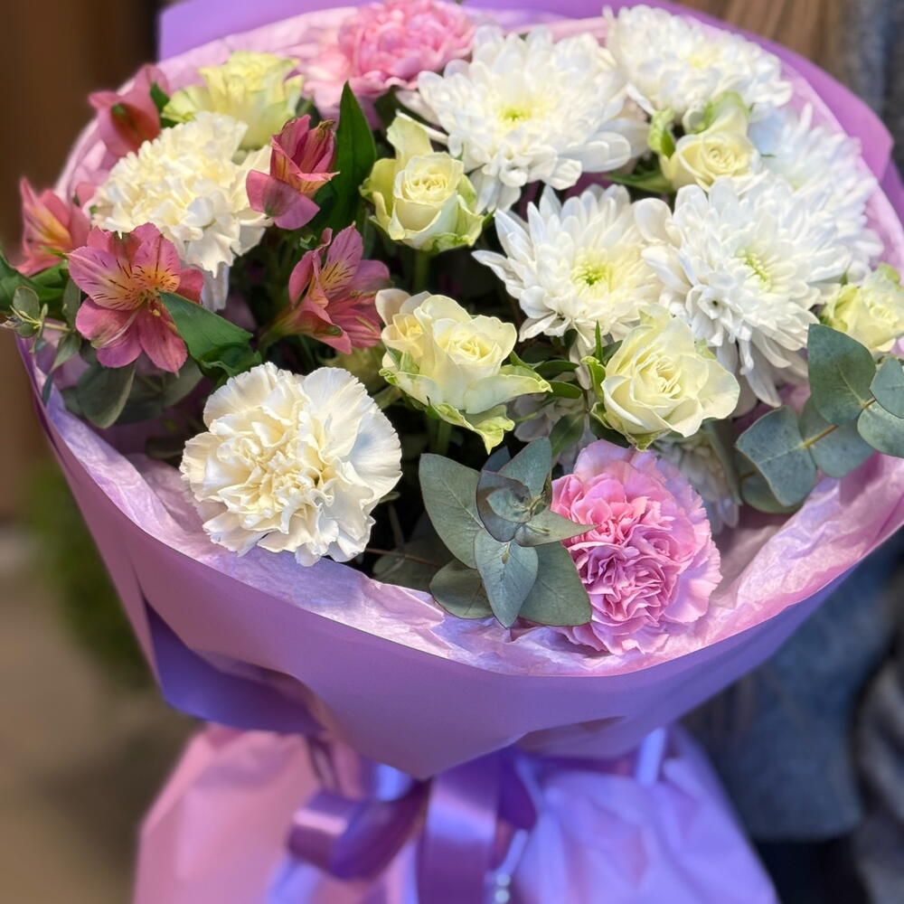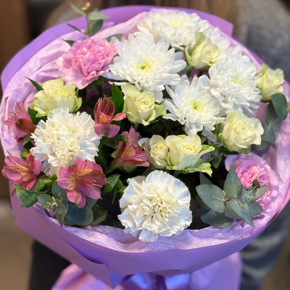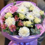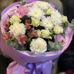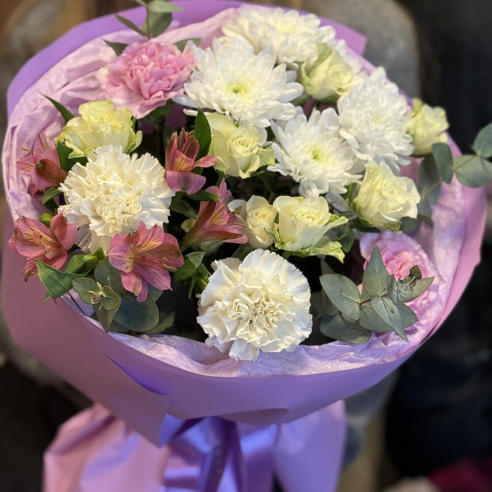 Alstroemeria - 1 pcs eukalyptus - 3 pcs rosa spray - 2 pcs hrizantema - 1 pcs disntus - 4 pcs