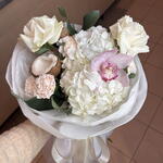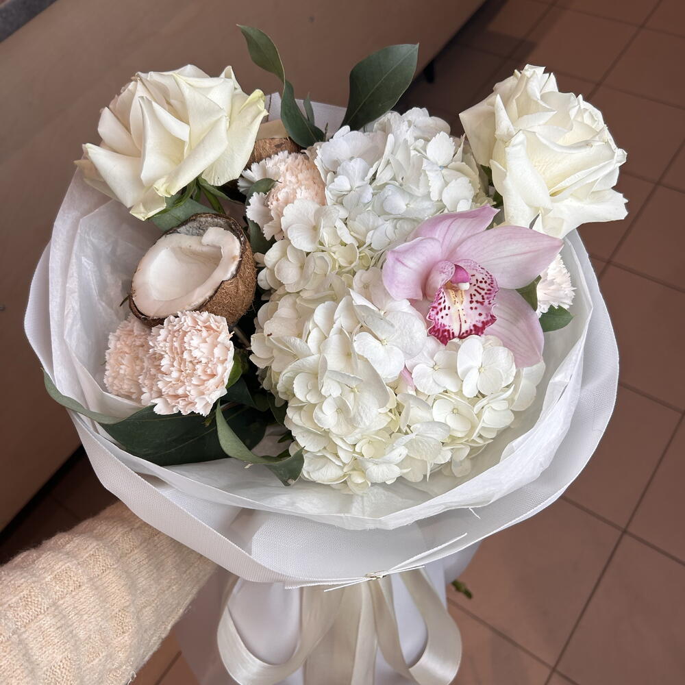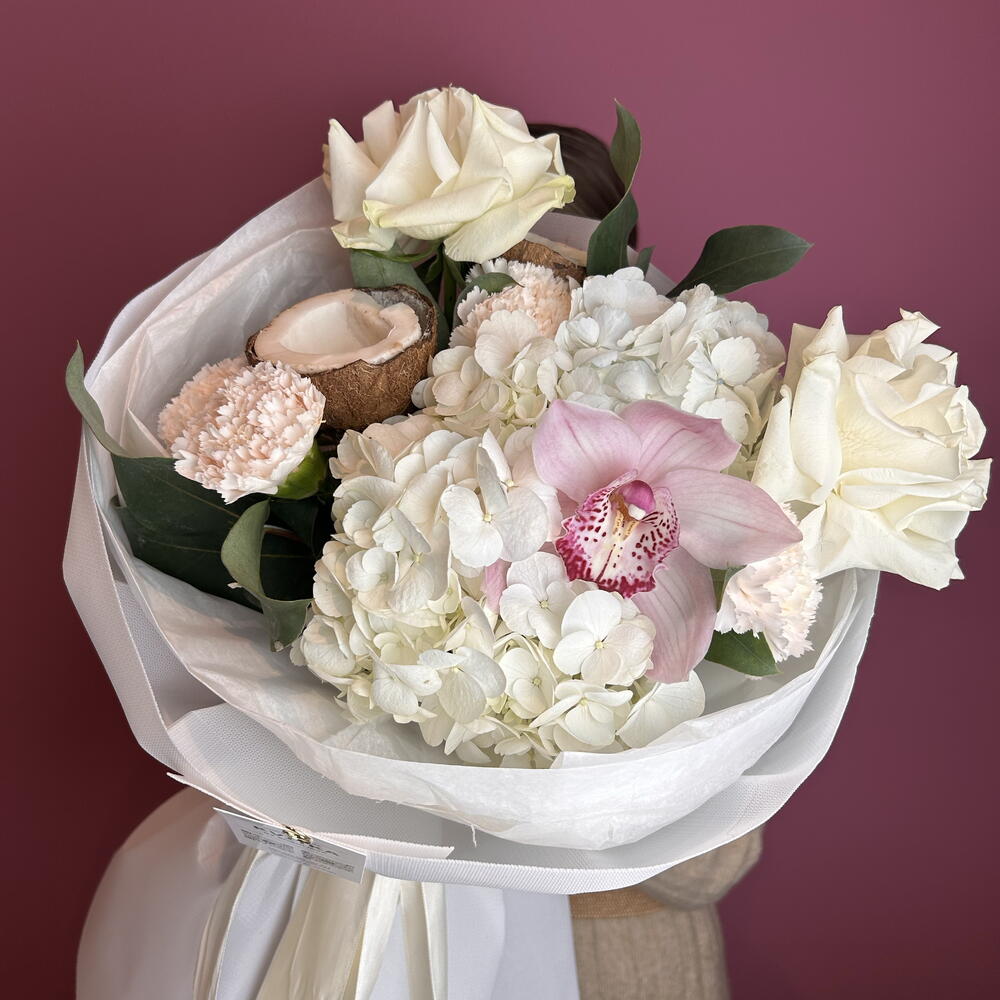 cymbidium - 1 pcs hydrangea - 2 pcs aquabox - 1 pcs carnations - 4 pcs decorative paper - 1 pcs white roses - 2 pcs coconut - 1 pcs