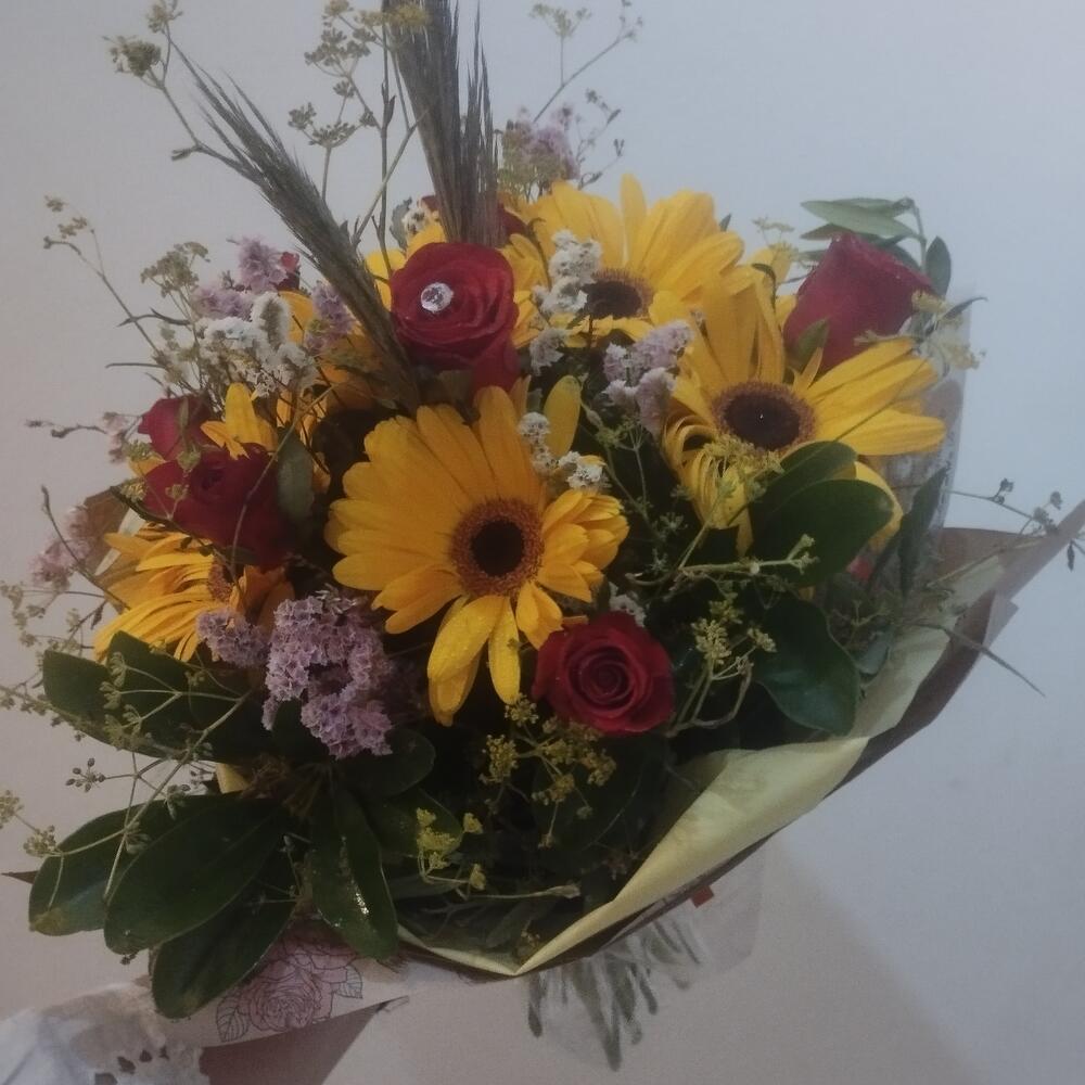 Este arranjo floral artesanal da Autoral é uma composição única de 6 elegantes rosas vermelhas, 4 cachos de trigo seco, 5 gérberas amarelas vibrantes e 3 ramos de limonium lilás. Ele é complementado com um toque de verde decorativo, que adiciona frescor e vivacidade ao design. Ideal para presente ou mesmo para embelezar em especial a sua casa. Este Bouque não é apenas uma decoração, é uma expressão artística.