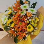 Gypsophila - 9 pcs celofan - 1 pcs margaridas brancas - 3 pcs verduras diversas - 9 pcs fita laço cordel - 3 pcs papel kraft marrom - 1 pcs fita cetim - 1 pcs margaridas amarelas - 3 pcs pendênte decorativo fantasia - 1 pcs margaridas laranjas - 3 pcs papel yellow - 1 pcs