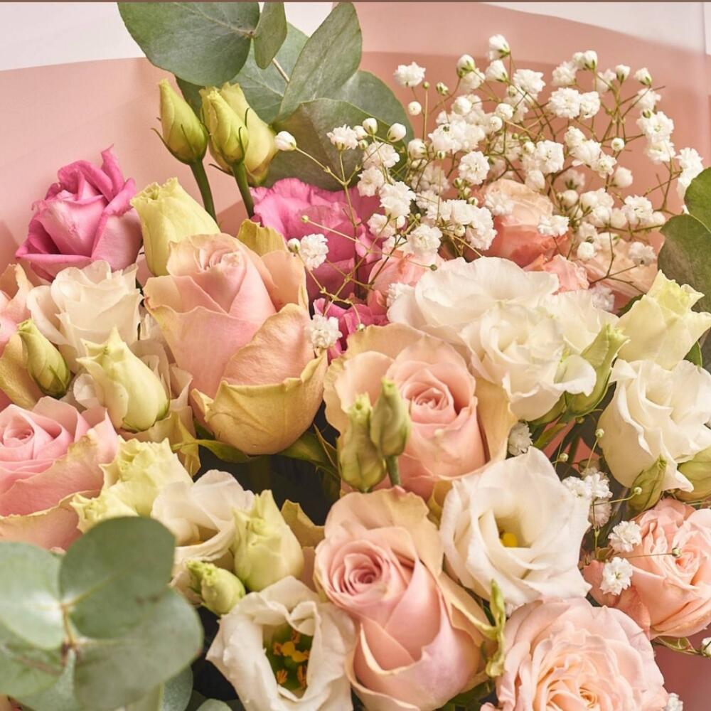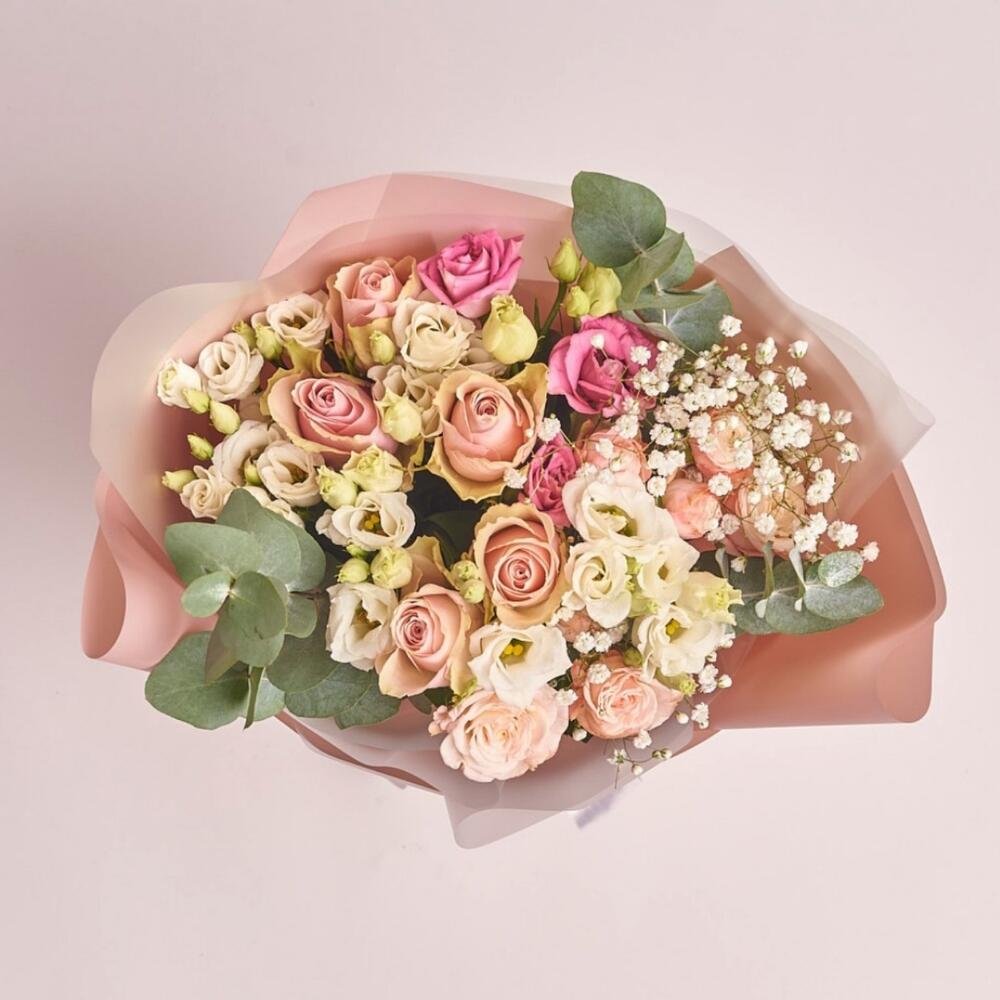 Eustoma - 3 pcs Eucalyptus - 2 pcs Gypsophila - 1 pcs rose - 10 pcs rose bush - 1 pcs decorative packaging - 1 pcs