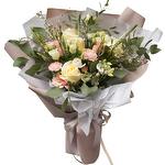 rose - 5 pcs decorative greenery - 10 pcs white eustoma - 1 pcs carnation shrub - 3 pcs