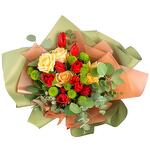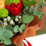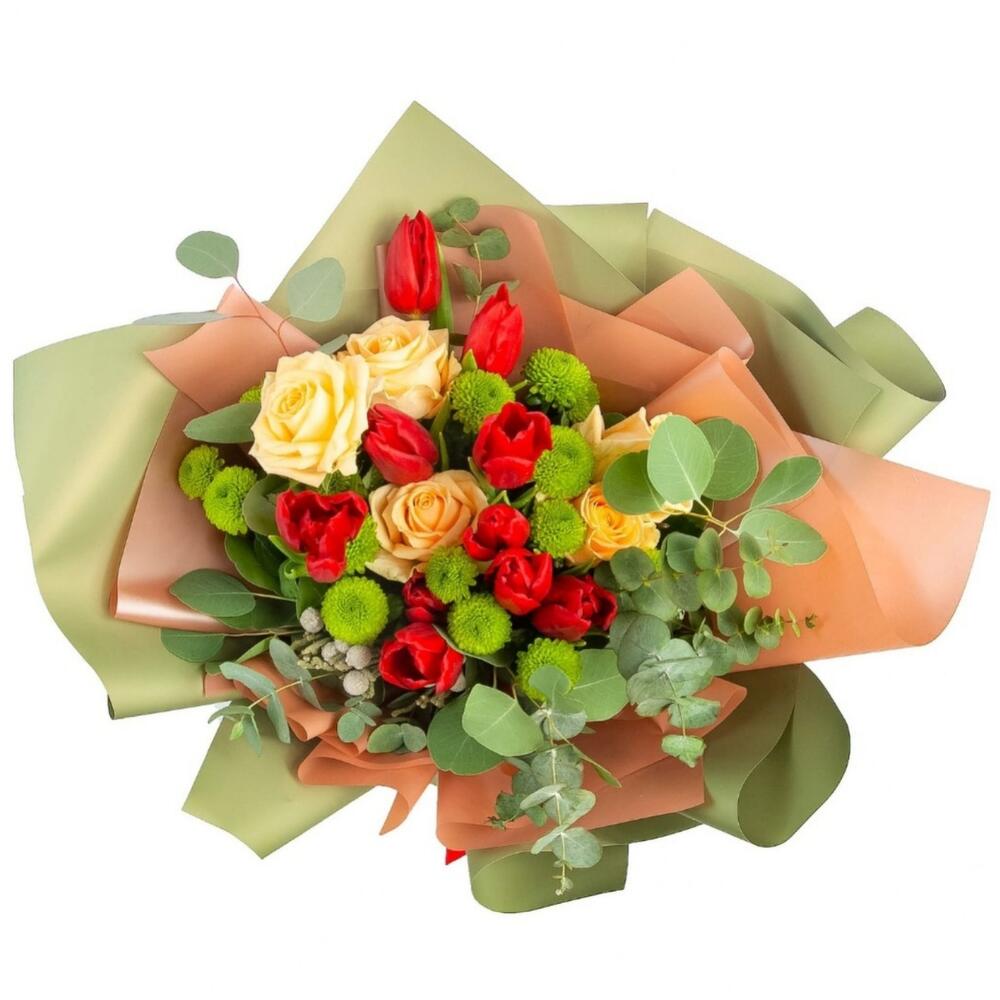 Eucalyptus - 3 pcs Tulip - 10 pcs rose - 5 pcs santini - 2 pcs decorative greens - 4 pcs decorative packaging - 3 pcs