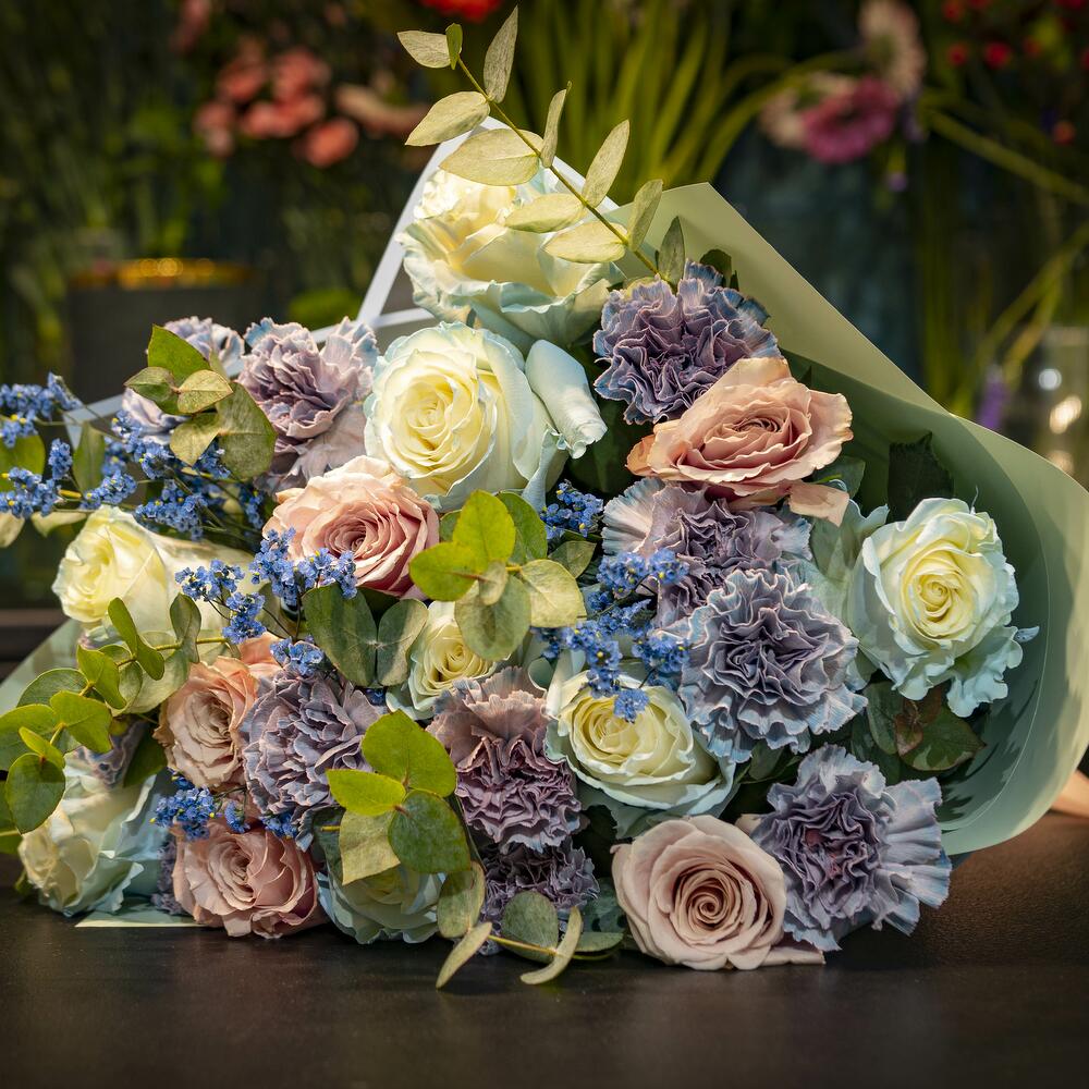 Limonium - 4 pcs Eucalyptus - 4 pcs carnation - 13 pcs roses - 12 pcs