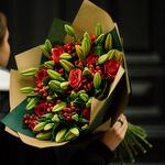 Red rose - 18 pcs red hypericum - 5 pcs orange lily - 7 pcs