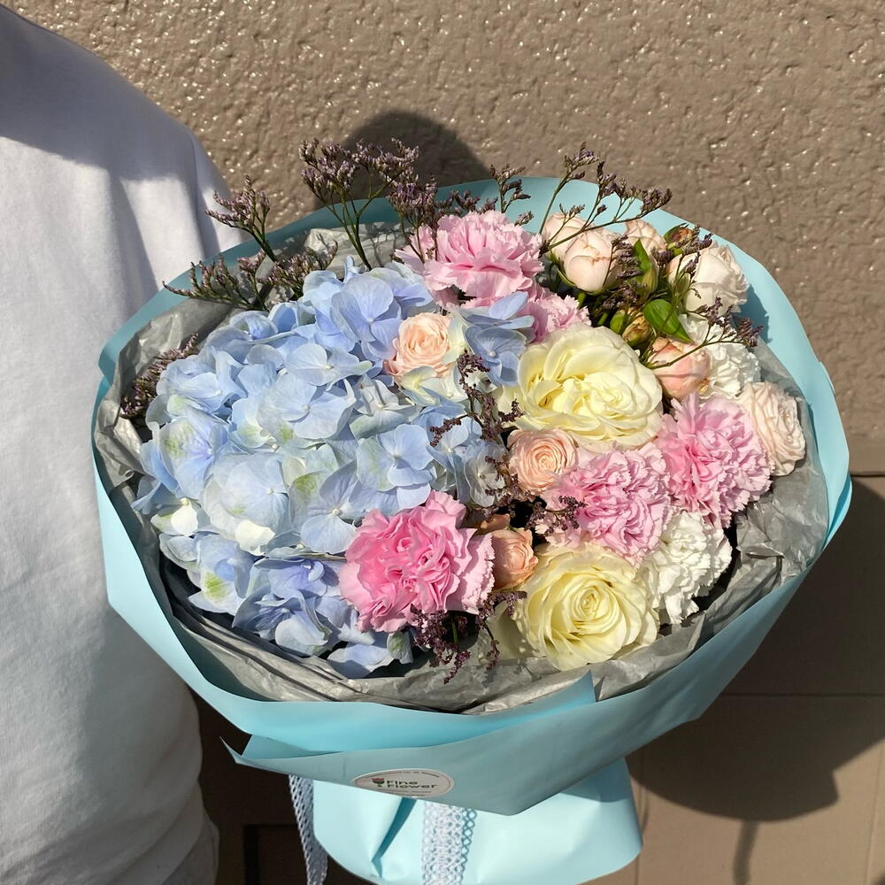 Limonium - 2 pcs Clematis - 1 pcs rose - 2 pcs hydrangea - 1 pcs spray rose - 1 pcs carnation - 7 pcs