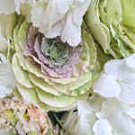 An unexpected bouquet combining decorative brassica and lush white hydrangea. Voluminous, sculptural, and made to surprise.
