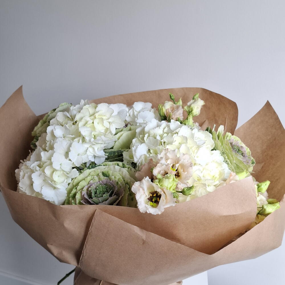 An unexpected bouquet combining decorative brassica and lush white hydrangea. Voluminous, sculptural, and made to surprise.