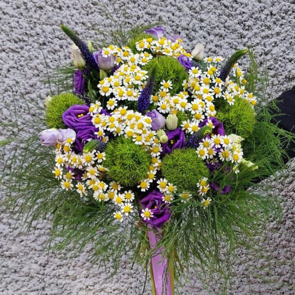Lisianthus - 5 pcs green carnation - 5 pcs chamomile - 5 pcs asparagus - 4 pcs purple accessory - 3 pcs