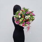 Eucalyptus - 5 pcs santini - 8 pcs carnation - 9 pcs hypericum - 5 pcs roses - 10 pcs alstremeria - 8 pcs
