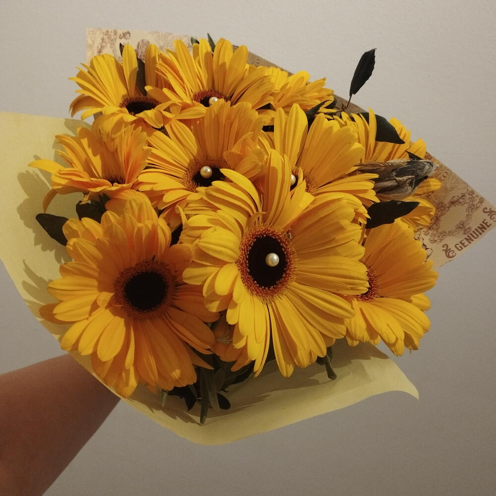 Bouquet Gereberas Amarelas Olho Veludo, OFERTA Verduras com 3 Pérolas Papel Kraft e Amarelo