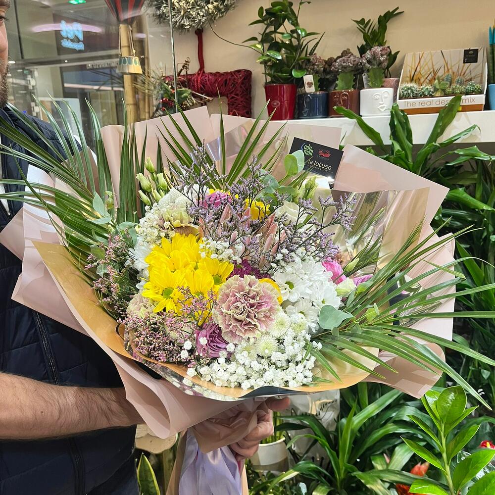 This richly textured bouquet features a stunning combination of fresh flowers. Accented with stunning statice and tied with a charming ribbon, this bouquet is a beautiful expression of lifes many nuances. Note: The design of the bouquet can be changed to a similar one if the required material is not available