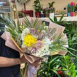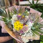 Satin ribbon - 1 pcs Eucalyptus - 4 pcs Limonium - 4 pcs Chrysanthemum - 4 pcs Gypsophila - 4 pcs Lisianthus - 1 pcs rose - 3 pcs decorative paper - 6 pcs carnation - 5 pcs protea - 1 pcs robelini - 3 pcs