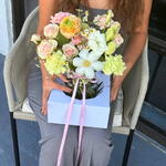 Eustoma - 1 pcs Tulip - 1 pcs Vase - 1 pcs chamomile - 2 pcs carnations - 6 pcs ranunculus - 1 pcs spray roses - 2 pcs