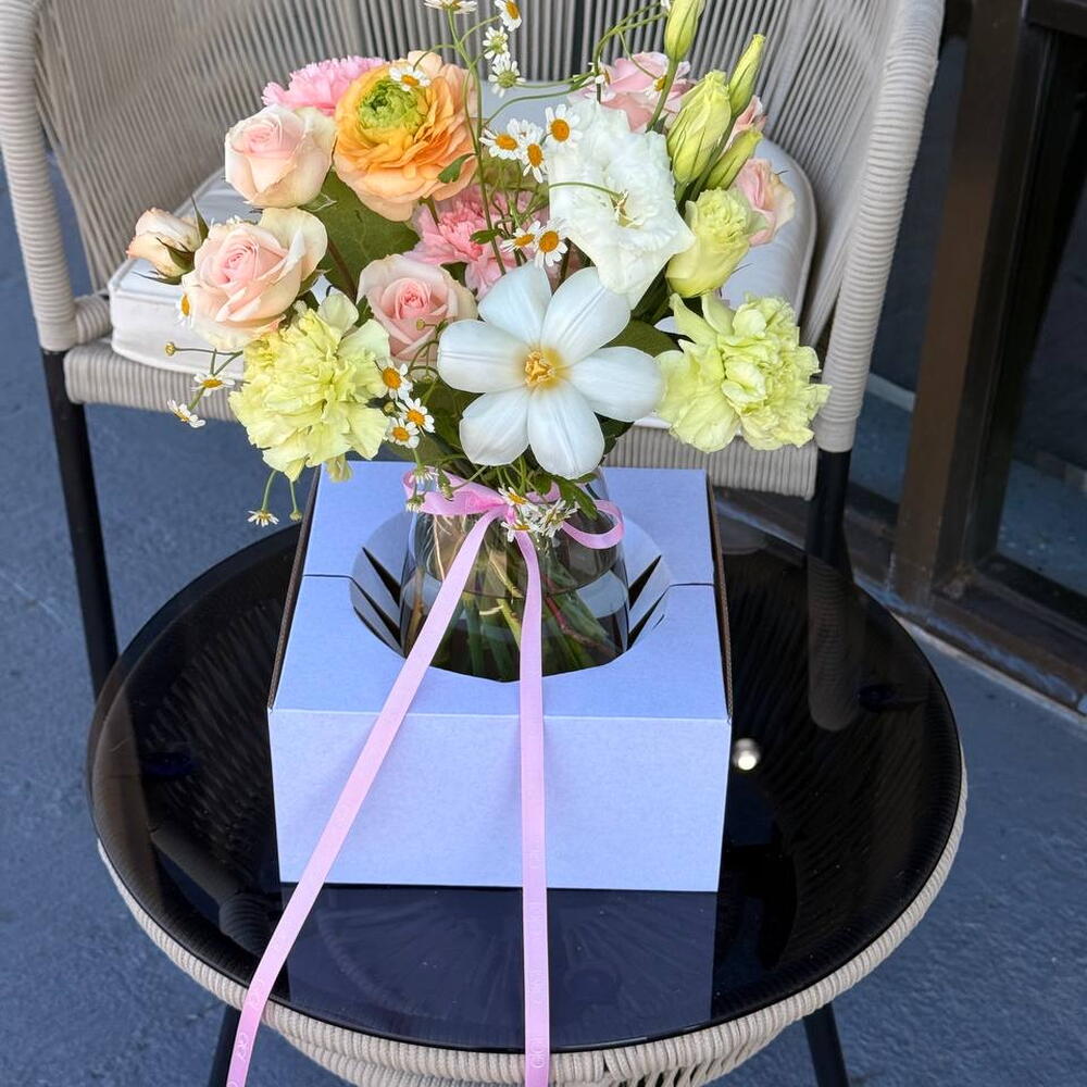 Eustoma - 1 pcs Tulip - 1 pcs Vase - 1 pcs chamomile - 2 pcs carnations - 6 pcs ranunculus - 1 pcs spray roses - 2 pcs