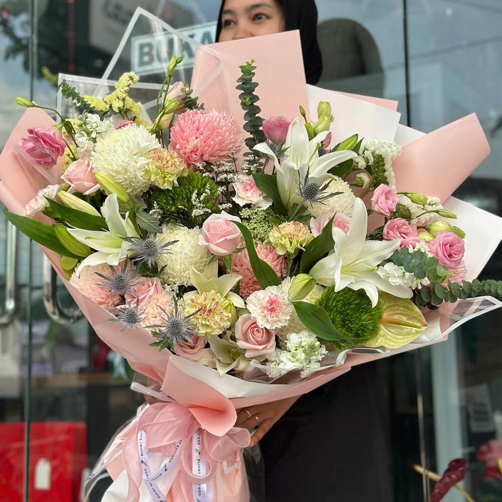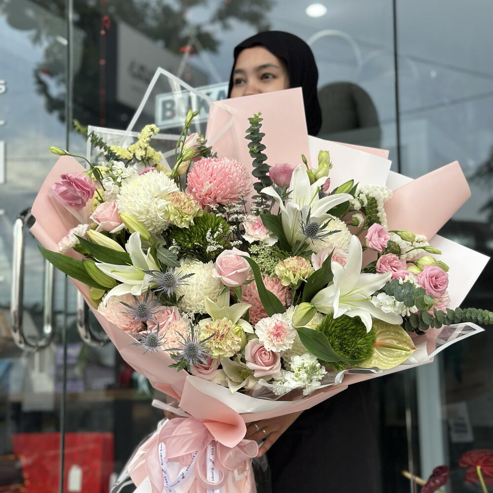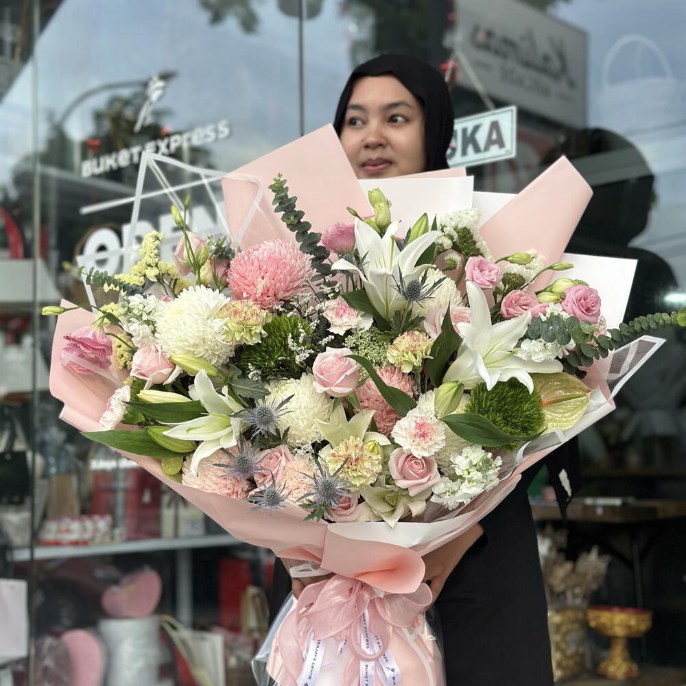 hydrangea green - 9 pcs eryngium - 2 pcs limonium white - 1 pcs amimajus - 1 pcs mathyola white - 3 pcs zen yang soft pink - 4 pcs zen yang white - 4 pcs eucalyptus xl - 1 pcs anturium import green - 2 pcs lily white original - 5 pcs eustoma pink chn - 5 pcs statice white chn - 1 pcs diantus peach brut - 1 pcs diantus green trick - 3 pcs statice yellow green - 1 pcs pink avalan - 8 pcs diantus yukari - 3 pcs diantus green mochi - 3 pcs