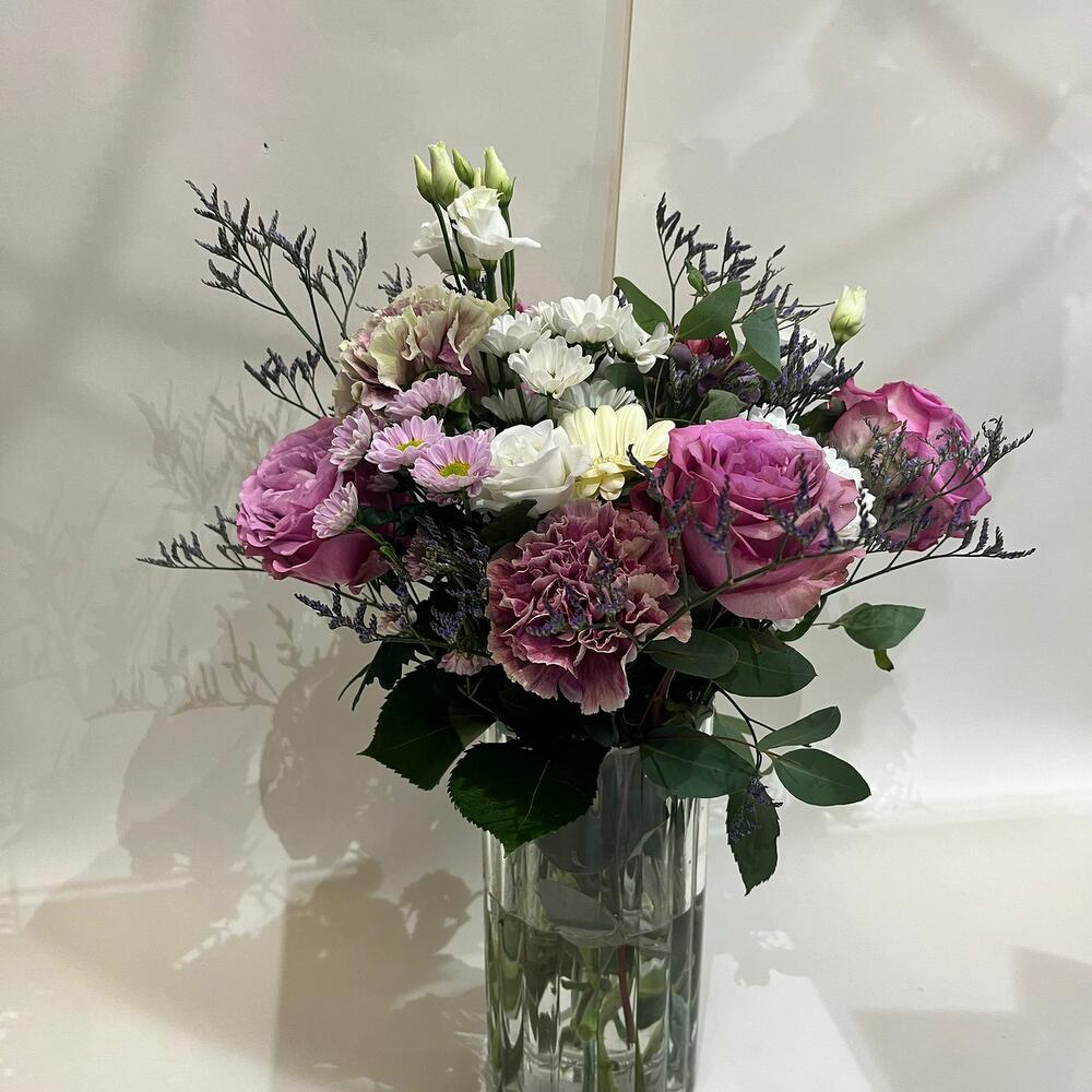 Limonium - 2 pcs Chrysanthemum - 4 pcs Lisianthus - 1 pcs rose - 4 pcs carnation - 3 pcs gerber - 2 pcs a vase - 1 pcs