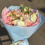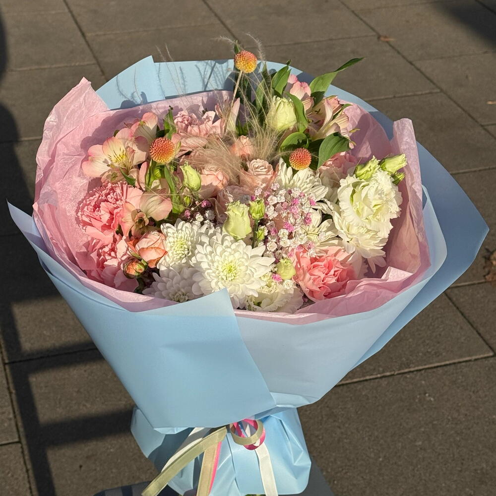 Eustoma - 1 pcs Spray rose - 1 pcs carnation - 6 pcs gypsophila - 1 pcs kraspedia - 2 pcs astromeria - 2 pcs chrysanthemum - 2 pcs kovyl - 1 pcs