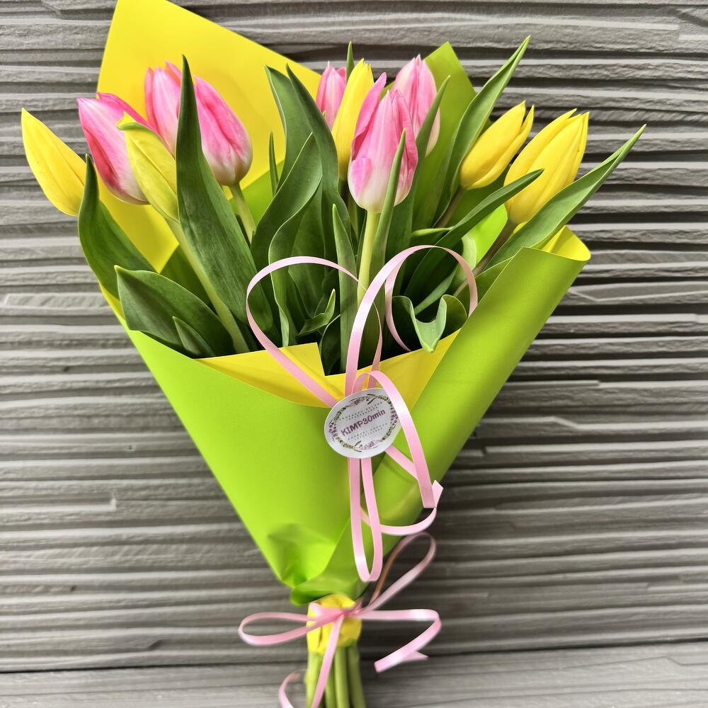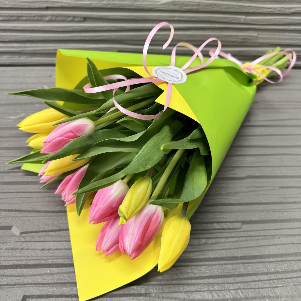 Bouquet of 11 pink and yellow tulips in festive packaging