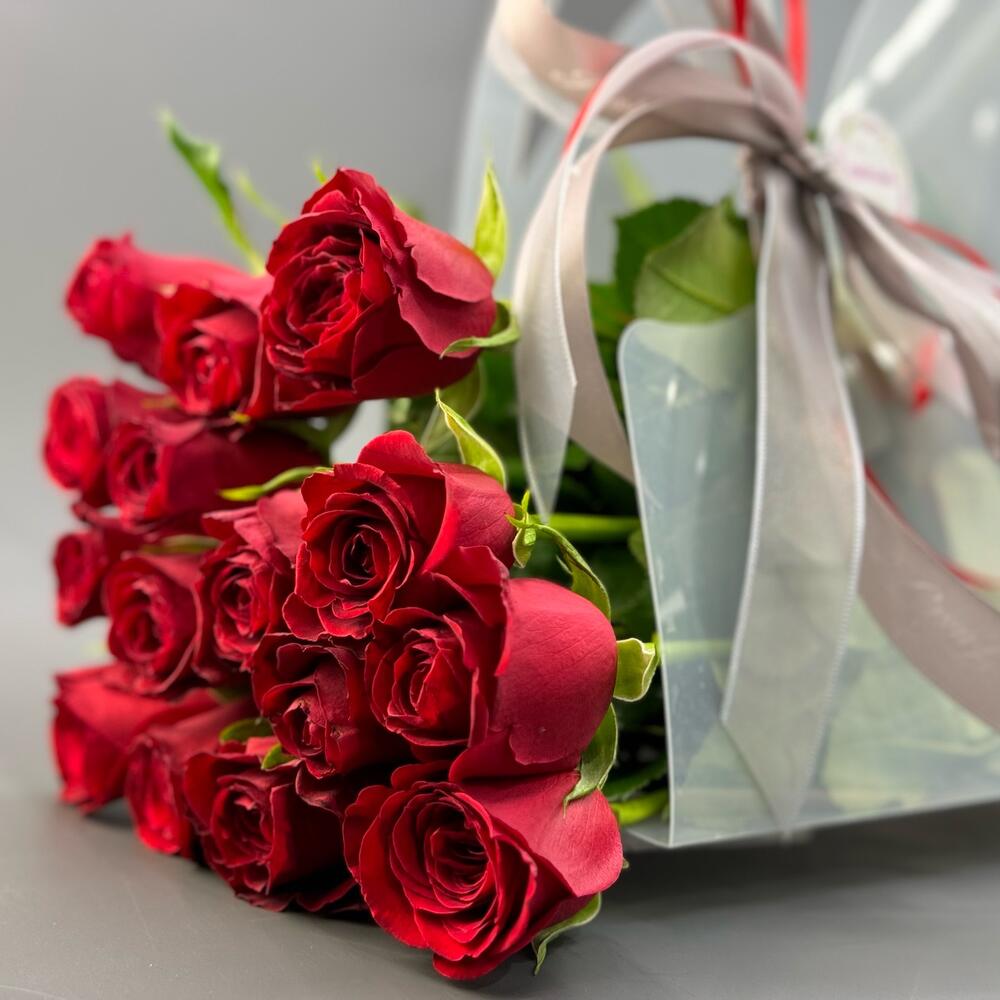 This is a luxurious bouquet of fresh red roses, carefully packed in a stylish transparent bag with an elegant ribbon. An ideal gift for a special occasion, be it a birthday, anniversary or an expression of love and gratitude. The elegant design with ribbons gives the bouquet a special sophistication.