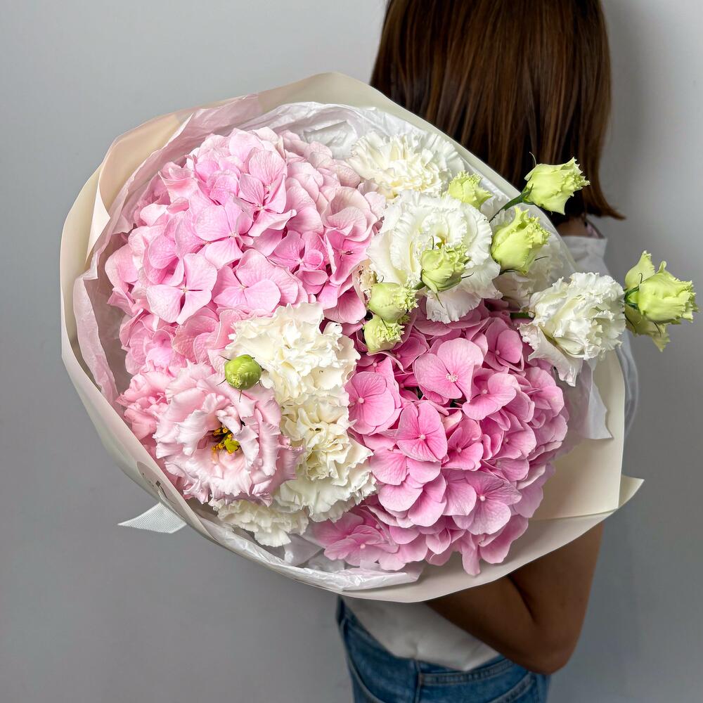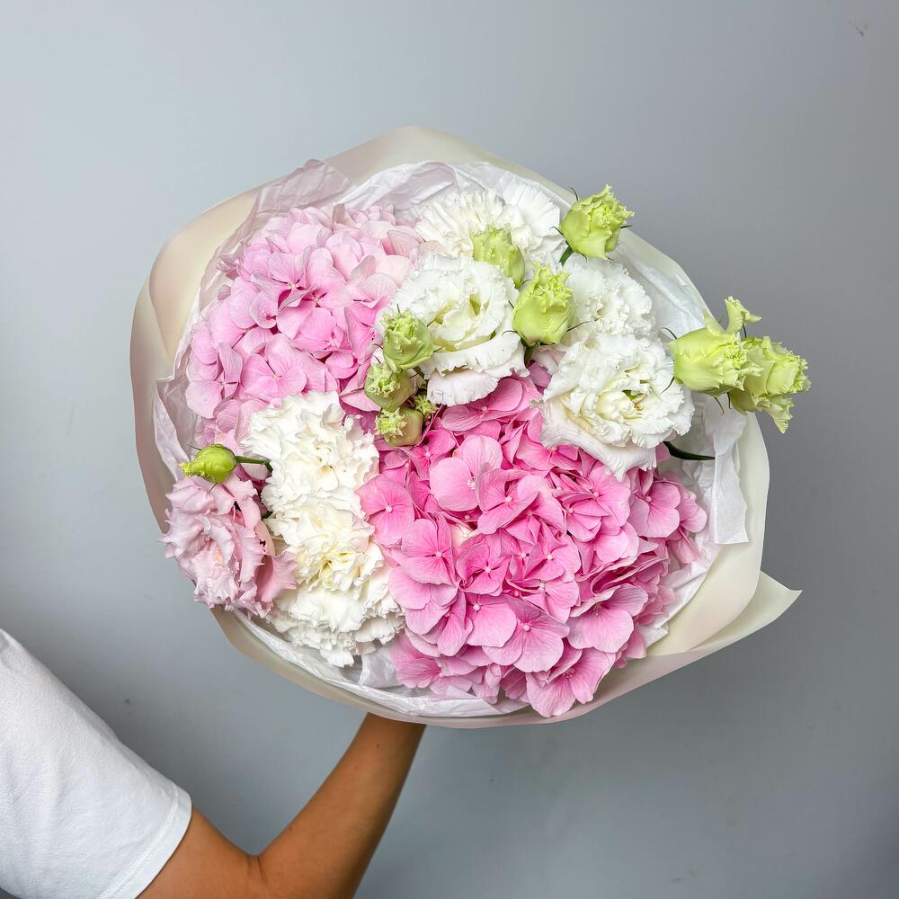 Hydrangea - 2 pcs Lisianthus - 3 pcs dianthus - 5 pcs aquabox - 1 pcs