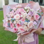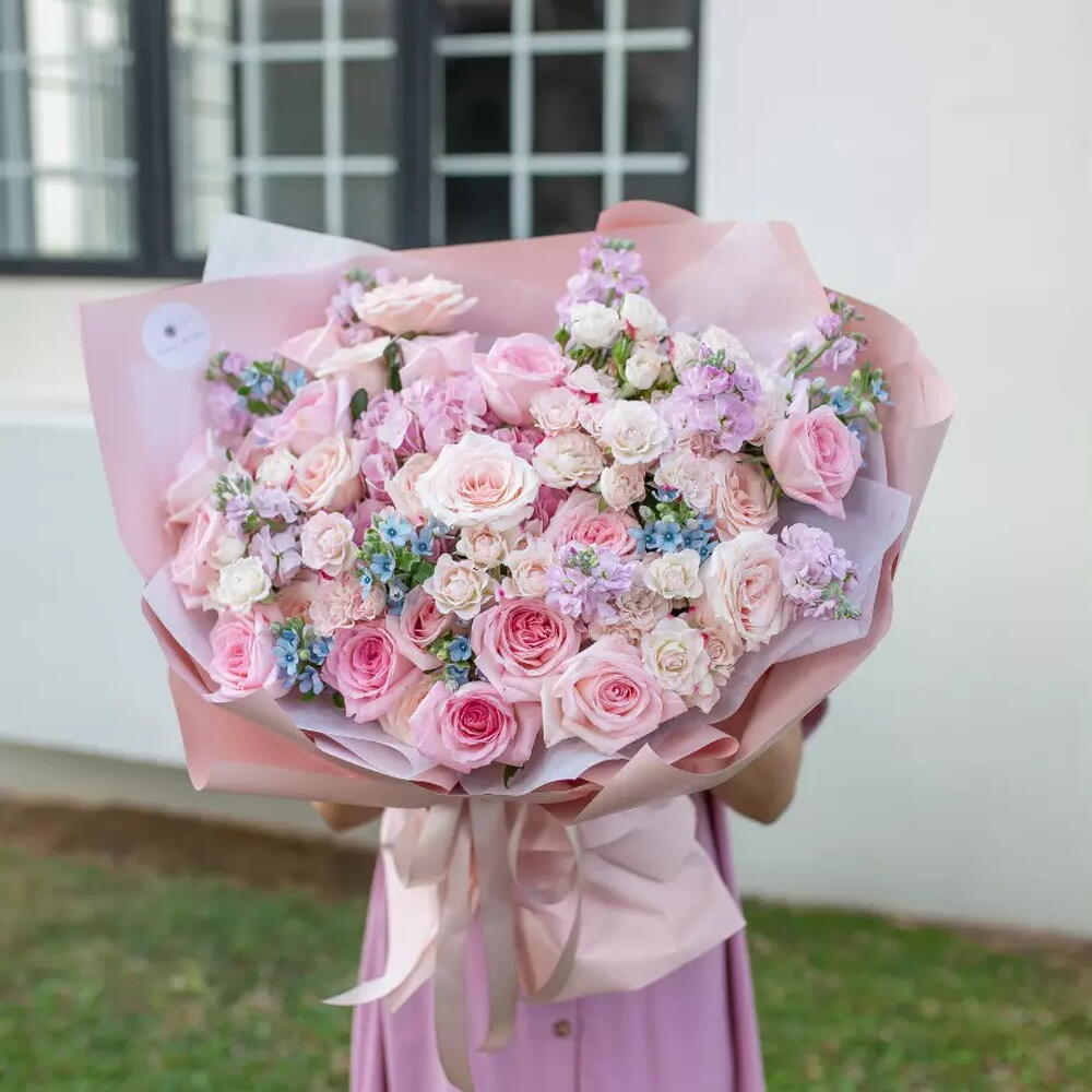 Immerse yourself in the enchanting fragrances and stunning visuals of our Florists Special bouquet. This masterfully curated assemblage features 6 sprigs of richly scented lavender, 18 soft pink roses melting with sublime elegance, 5 whimsical sprigs of myosotis and 12 light blush garden roses, a sight to behold and an experience to remember. A perfect blend of natures beauty which captivates the senses with an unforgettable charm, a perfect choice for any occasion.
